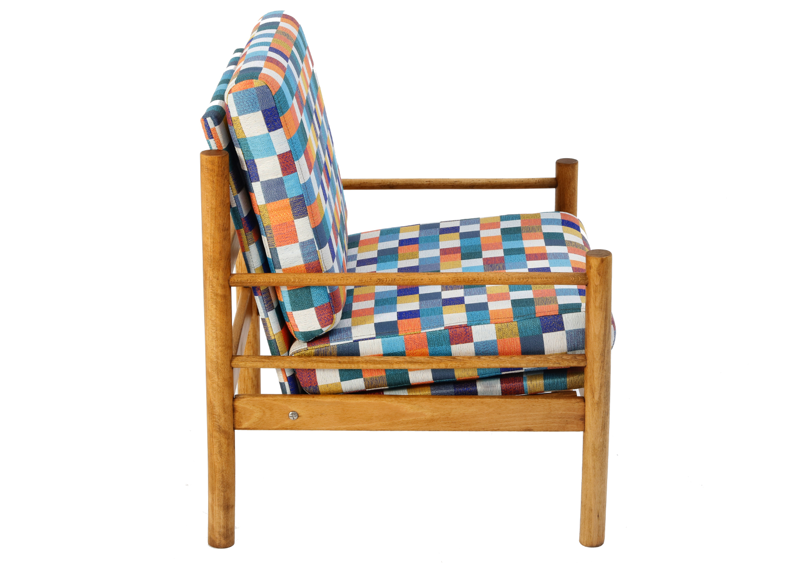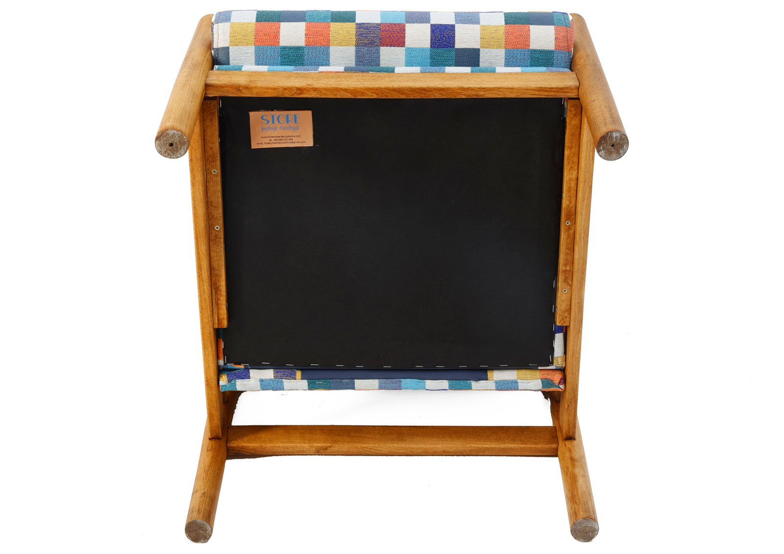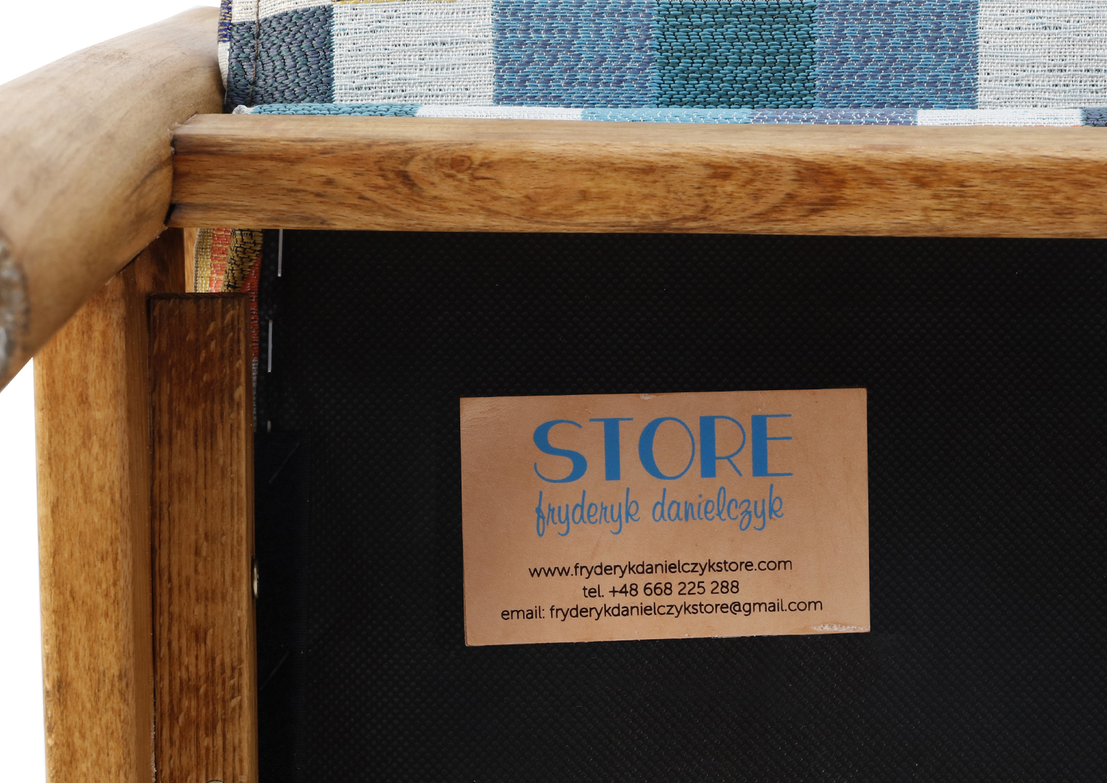 The chair has been disassembled, the wood has been stripped of the old coats of varnish, glued together again and treated with Chinese natural and eco-friendly oil. Made of beech wood. New upholstery, foam, webbing, and interfacing. Hand sewn. High quality fabric, durable, able to withstand 30 000 double rubs. New metal screws. Internal scaffolding has been sanded down thoroughly. The shape of the back rest and a thick set make the chair sturdy and comfortable. The wood is warm and smooth to touch. The physical qualities of the wood make the chair very practical and pretty at the same time. Its classic elegance makes it perfect for a study or a living room.