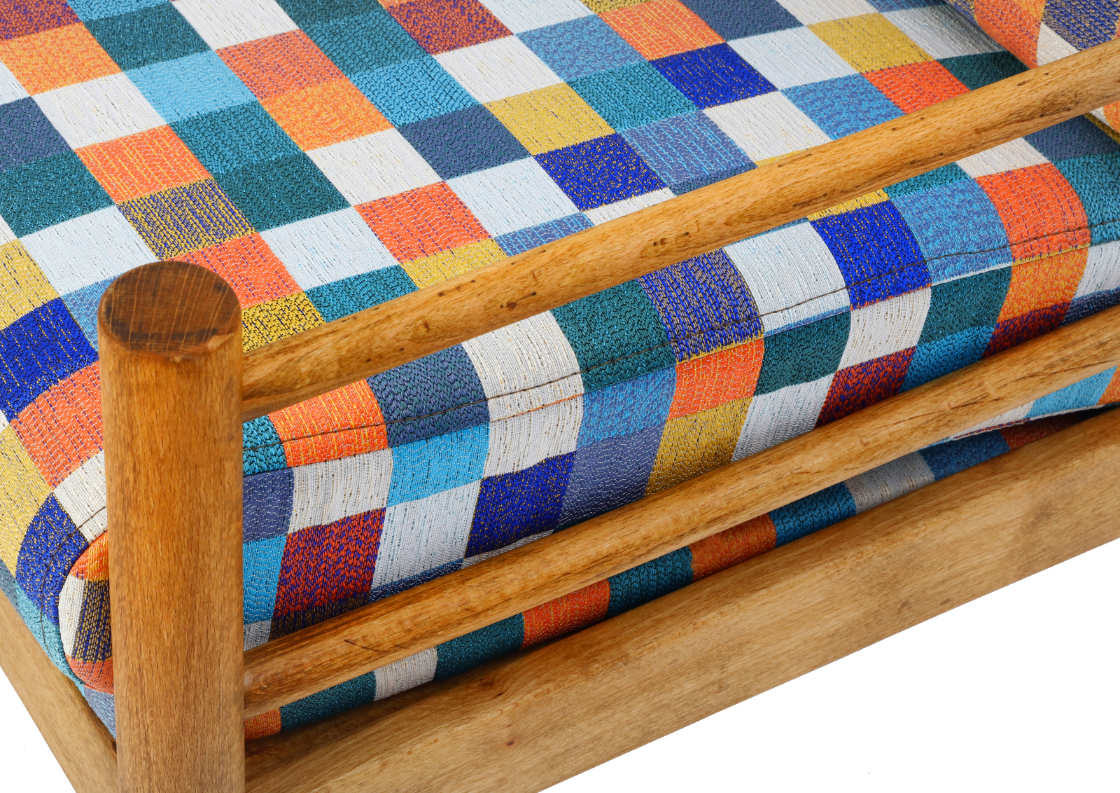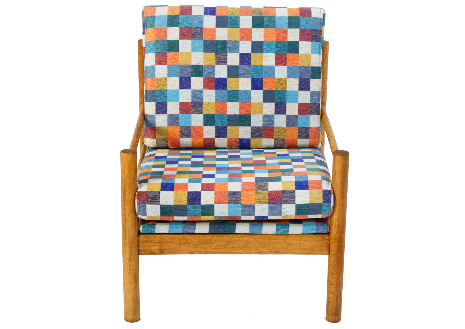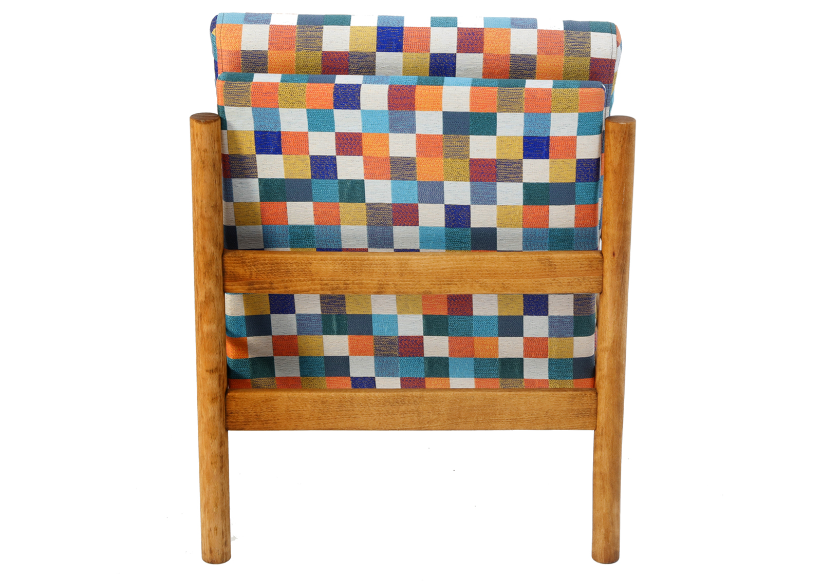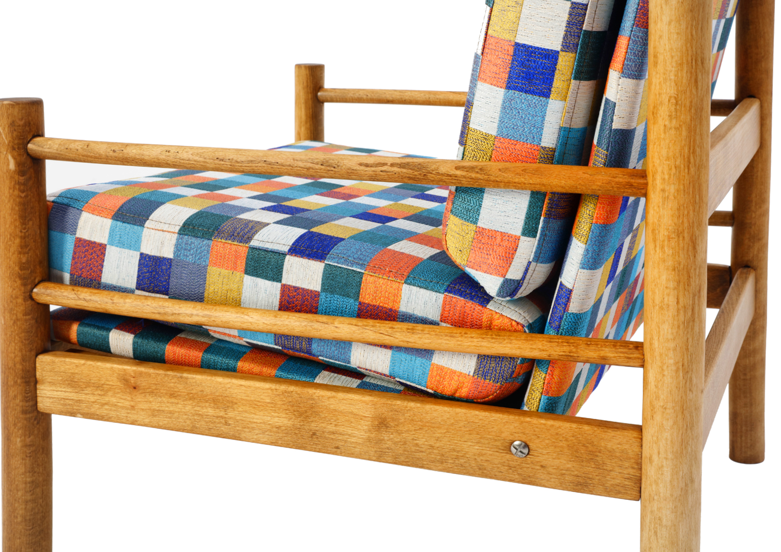 The chair has been disassembled, the wood has been stripped of the old coats of varnish, glued together again and treated with Chinese natural and eco-friendly oil. Made of beech wood. New upholstery, foam, webbing, and interfacing. Hand sewn. High quality fabric, durable, able to withstand 30 000 double rubs. New metal screws. Internal scaffolding has been sanded down thoroughly. The shape of the back rest and a thick set make the chair sturdy and comfortable. The wood is warm and smooth to touch. The physical qualities of the wood make the chair very practical and pretty at the same time. Its classic elegance makes it perfect for a study or a living room.