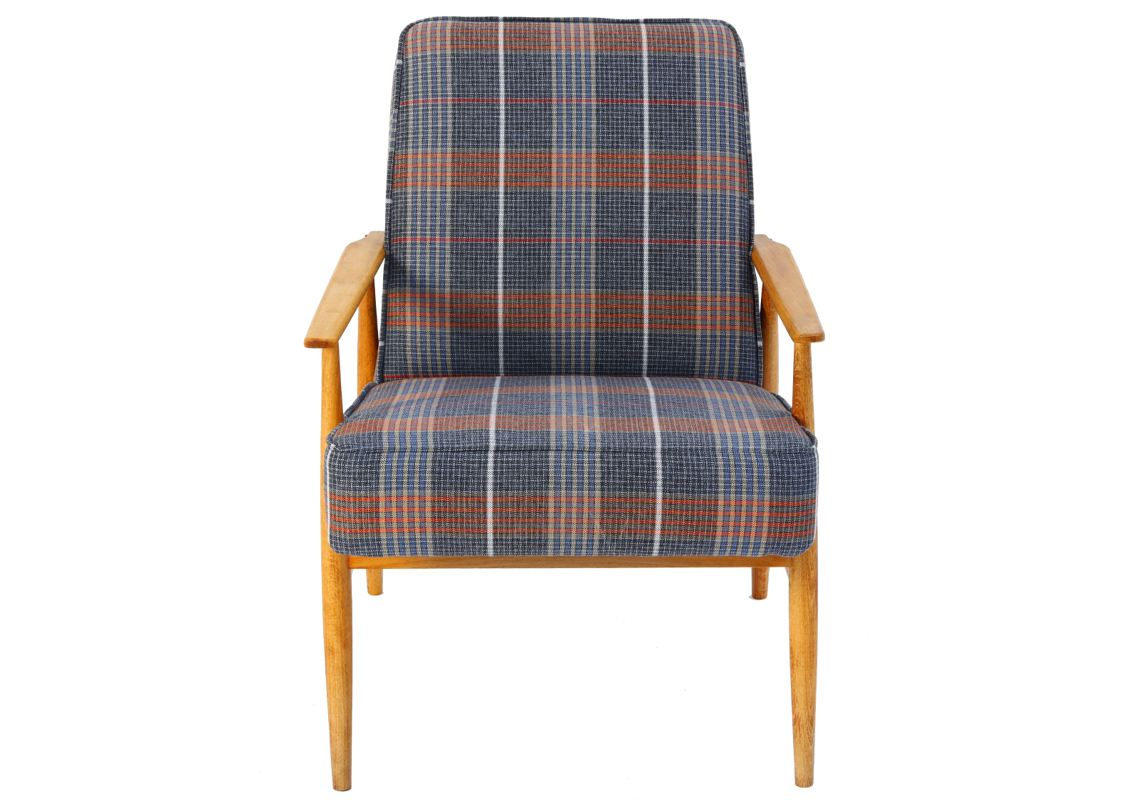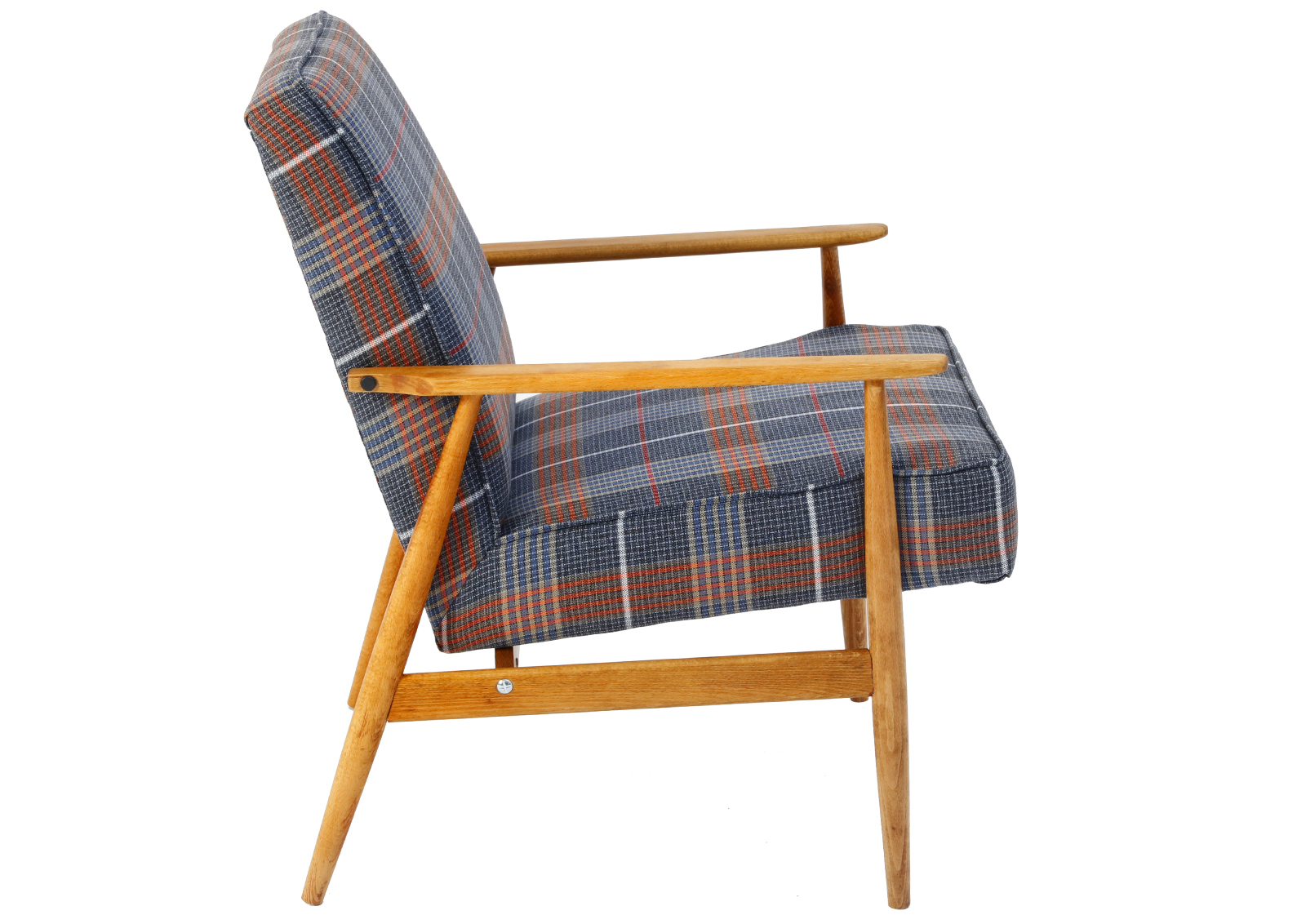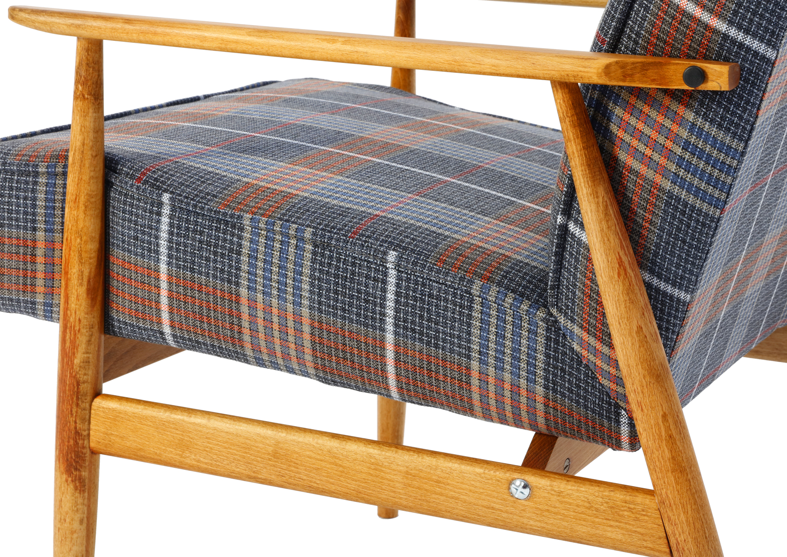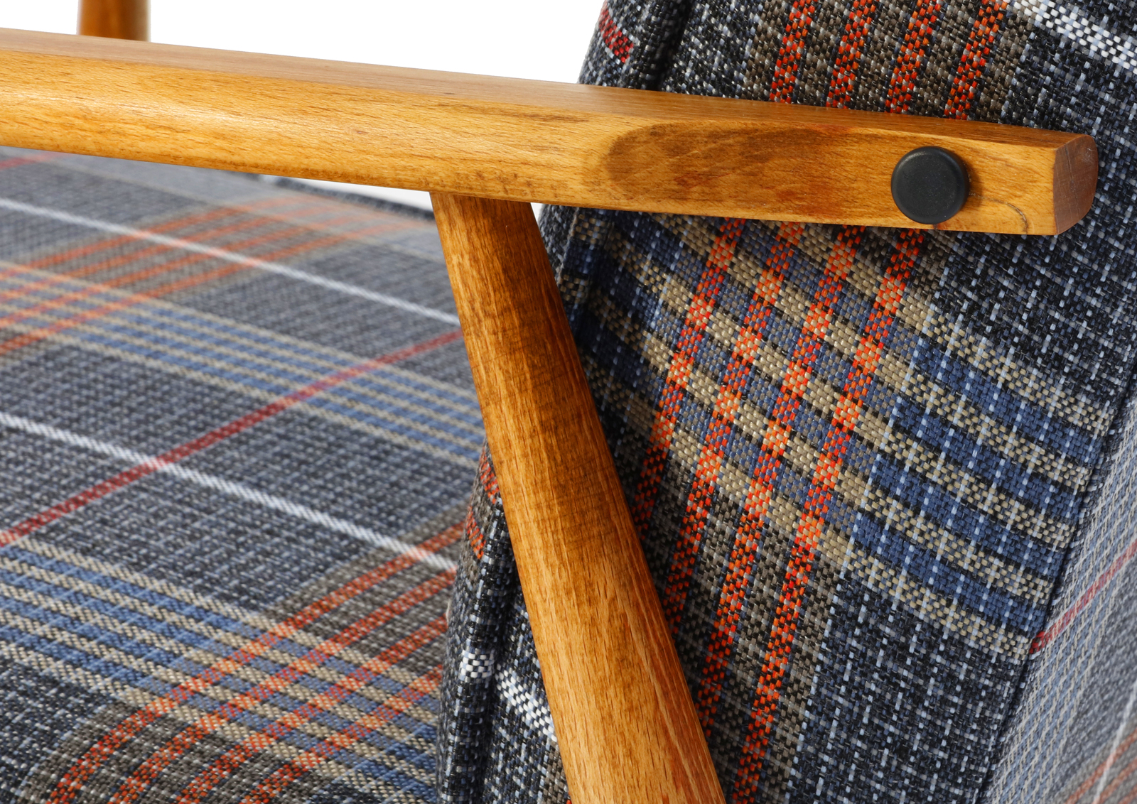 The armchair has been disassembled, the old coats of varnish fully removed, the armchair then has been glued together again, treated with Chinese natural and eco-friendly oil. Beech, new upholstery, foam, webbing, and interfacing. Hand sewn. Very high quality fabric, durable, able to withstand 30 000 double rubs. New metal screws. Internal scaffolding has been sanded down. Cult Lisek model but with a twist.