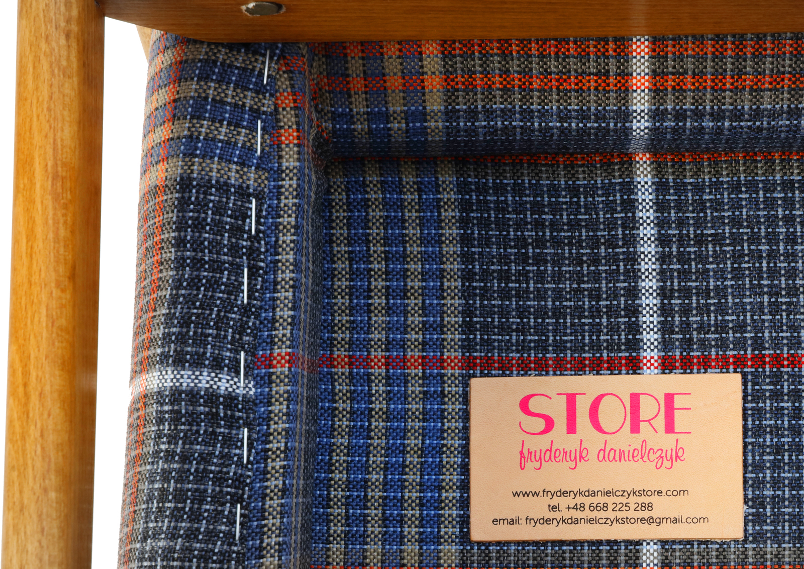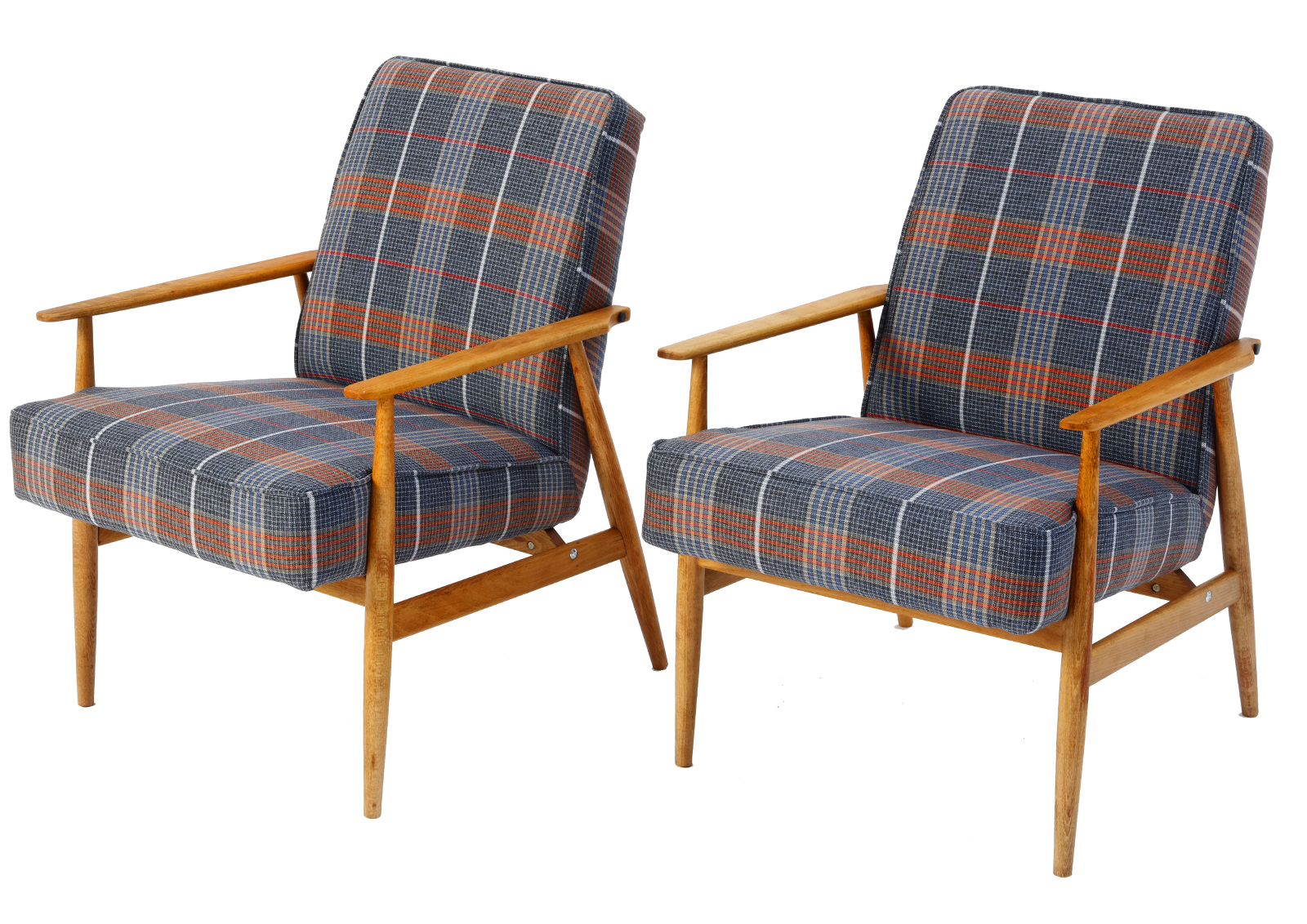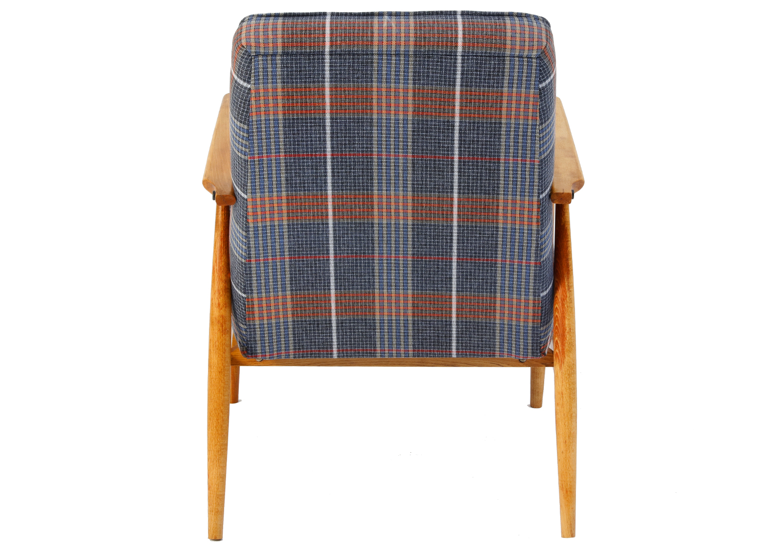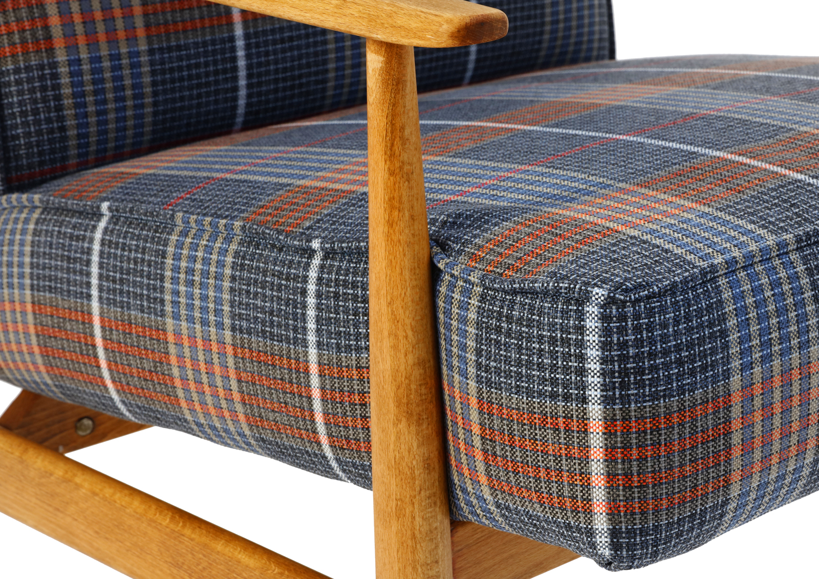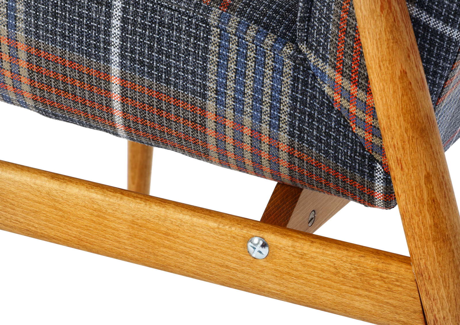 The armchair has been disassembled, the old coats of varnish fully removed, the armchair then has been glued together again, treated with Chinese natural and eco-friendly oil. Beech, new upholstery, foam, webbing, and interfacing. Hand sewn. Very high quality fabric, durable, able to withstand 30 000 double rubs. New metal screws. Internal scaffolding has been sanded down. Cult Lisek model but with a twist.