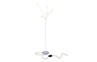 The lamp has been stripped of old coatings and then painted using automotive wet painting technique. White and lilac varnishes have been used and secured with transparent matt finish. The lamp has also gained a new jute braided power cable and a vintage plug.
