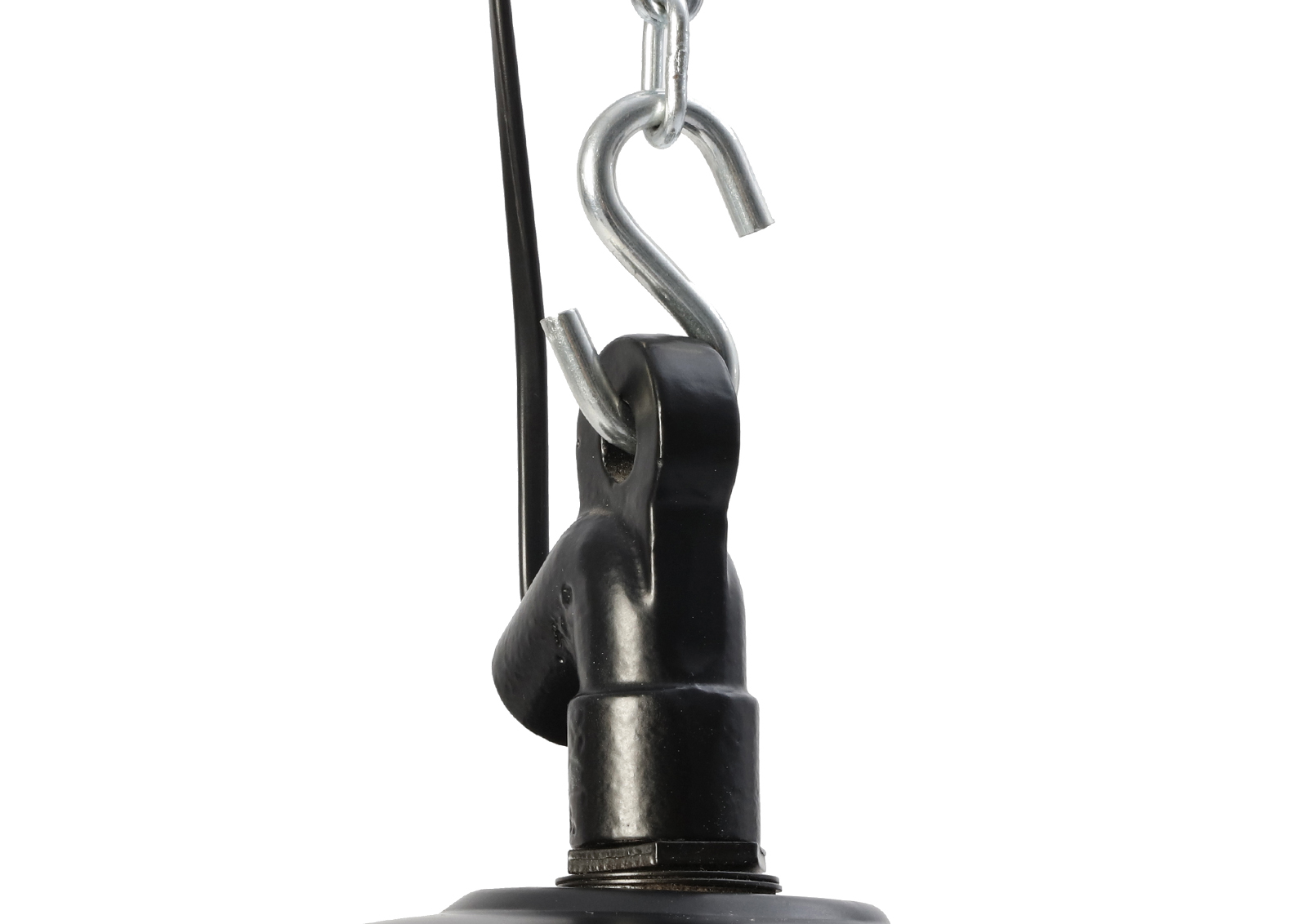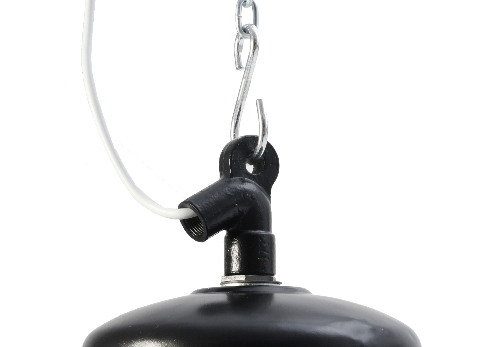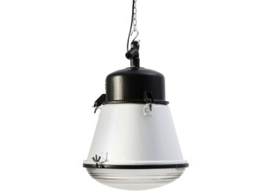 The body of the lamp is a high pressure die casting made of an aluminium alloy. It was originally coated with grey hammer finish paint. It has been stripped of the old coat of paint, sanded and powder coated with black on the outside and reflective white on the inside. The lamp has a Fresnel lens at the bottom end with concentric annular ridges. The original screws and other joining elements have been cleaned and refitted. The set is complete with 30 cm of steel chain, cables, a metal hook and a dimmable LEXMAN halogen 70 W bulb compared to a conventional 100 W bulb. Warm yellow light, 2800K. Ready to be fitted. 2 items available in this colour. A cult lamp from the Polish People’s Republic era.