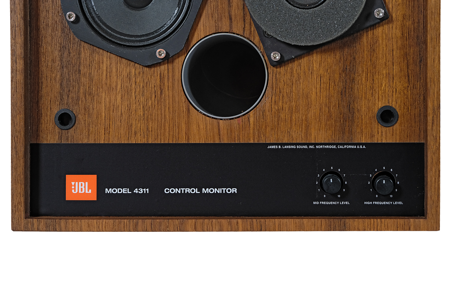Meanwhile, the 4310 model was being tested, which lead to a conclusion that the unique uninterrupted treatment of flat deflectors did not provide as significant acoustic advantages as expected. Therefore, this feature was removed. In order  to increase the dispersion of high frequencies, the tweeter was replaced with a different one with a smaller diameter. Also the crossover frequencies were modified to provide a smoother response. The version was given the number 4311 and was built with a conventional recessed baffle and with an H.F. radiator raised to the acoustic plane of the woofer and the front edge of the enclosure. It was recommended by JBL as “a smooth, powerful, broadband response in a compact packaging”.
