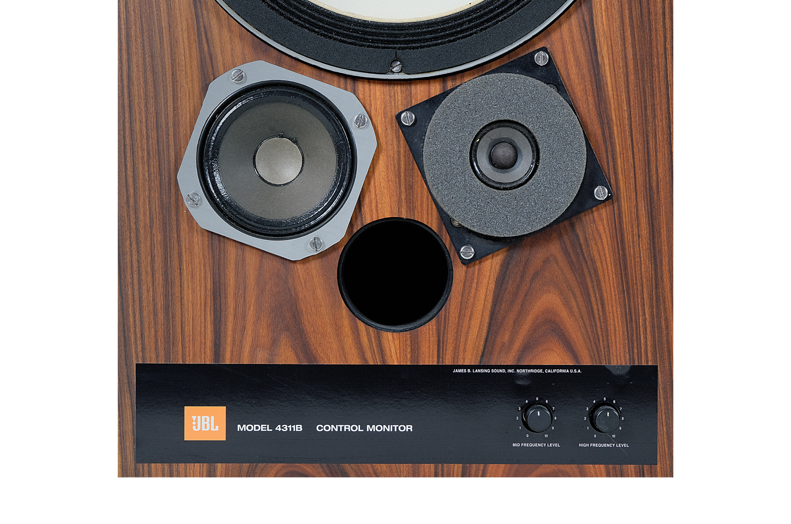 Meanwhile, the 4310 model was being tested, which lead to a conclusion that the unique uninterrupted treatment of flat deflectors did not provide as significant acoustic advantages as expected. Therefore, this feature was removed. In order to increase the dispersion of high frequencies, the tweeter was replaced with a different one with a smaller diameter. Also the crossover frequencies were modified to provide a smoother response. The version was given the number 4311 and was built with a conventional recessed baffle and with an H.F. radiator raised to the acoustic plane of the woofer and the front edge of the enclosure. It was recommended by JBL as “a smooth, powerful, broadband response in a compact packaging”.