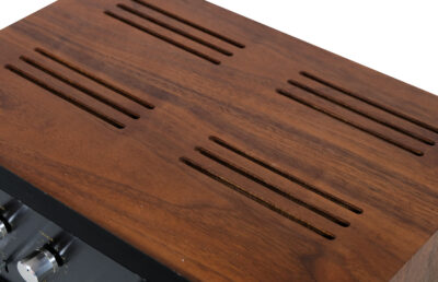 The enclosure has been cleaned of old coatings. The wood finishing is Chinese oil produced from natural oils and natural turpentine-based beeswax. The wood is extremely nice to the touch. Potentiometers are in perfect condition. Back elements of the enclosure were cleaned and painted using the automotive wet painting technique. The device has been fully reviewed and serviced.