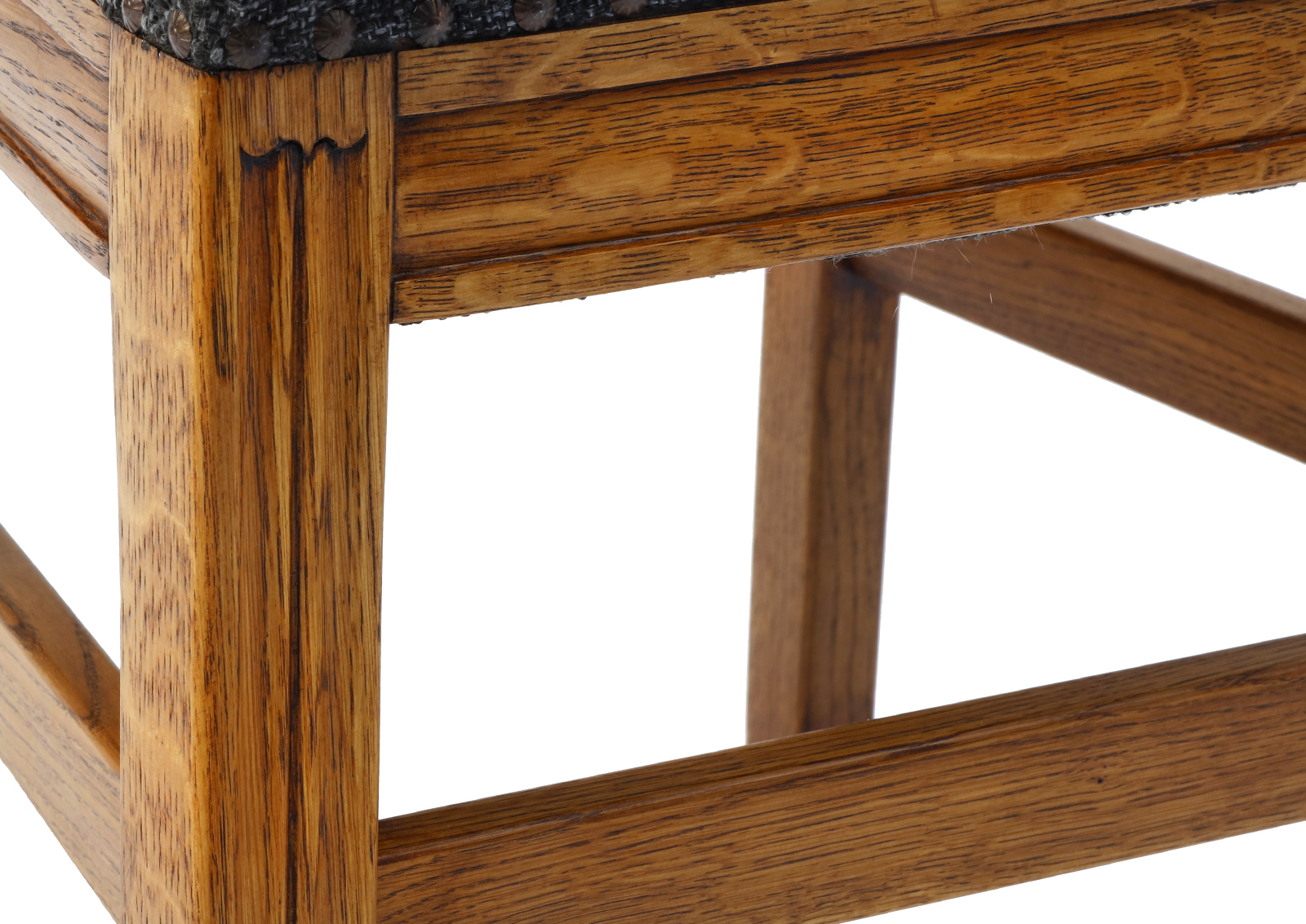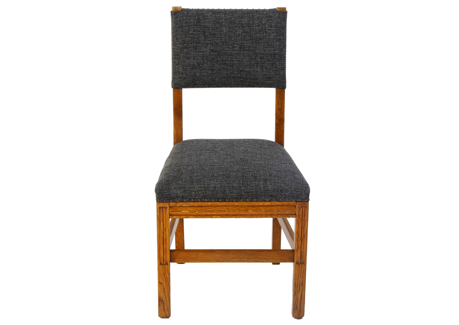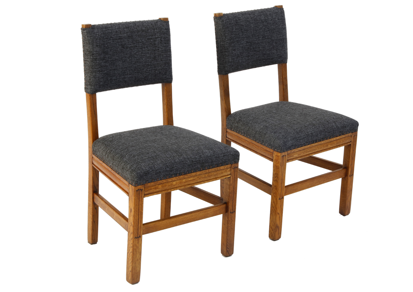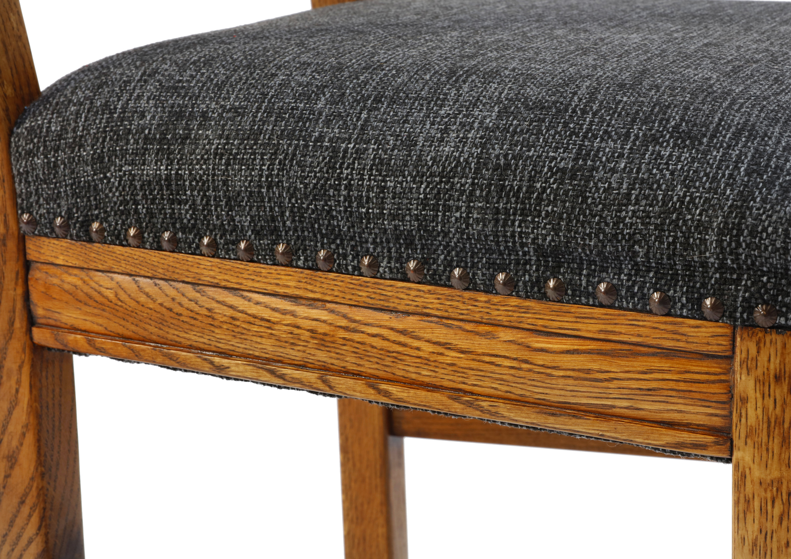 Made of oak. The chairs have been disassembled, the old coats of varnish fully removed, the armchair has then been glued together again, treated with Chinese natural and eco-friendly oil. New upholstery, foam, webbing, and interfacing, springs reattached. High quality fabric, durable, able to withstand 20 000 double rubs. Very comfortable, well-shaped. Ideal dinner table chairs.