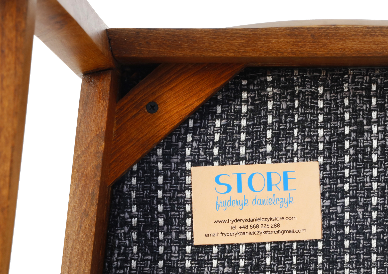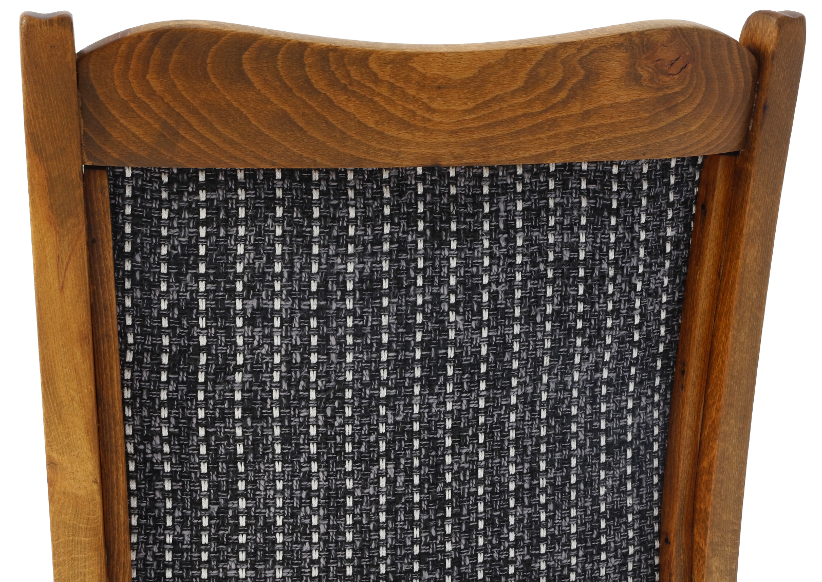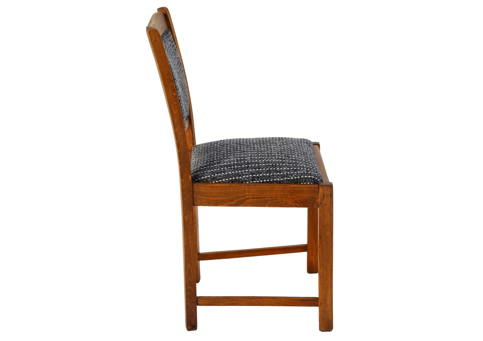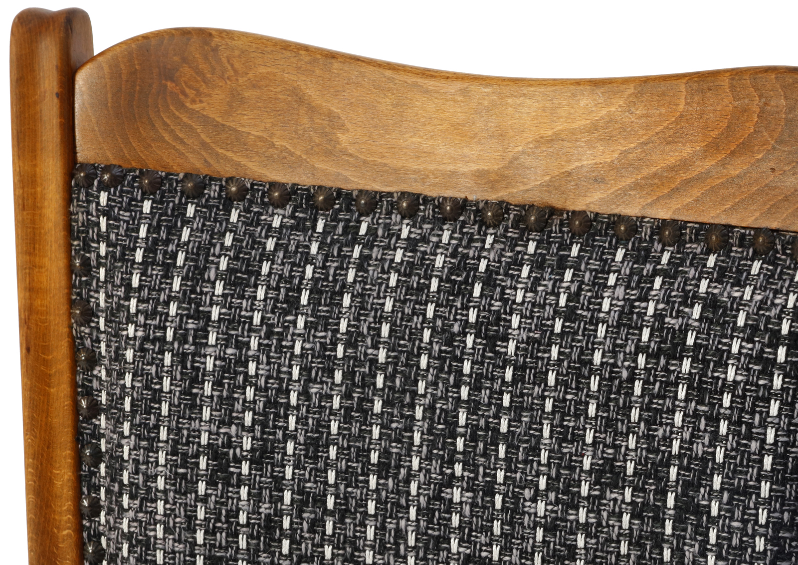 Made of beech. The chairs have been disassembled, the old coats of varnish fully removed, the armchair has then been glued together again, treated with Chinese natural and eco-friendly oil. New upholstery, foam, webbing, and interfacing, springs reattached. High quality fabric, durable, able to withstand 20 000 double rubs. Internal scaffolding sanded down thoroughly, coated with a protective layer. Very comfortable, well-shaped. Ideal dinner table chairs.