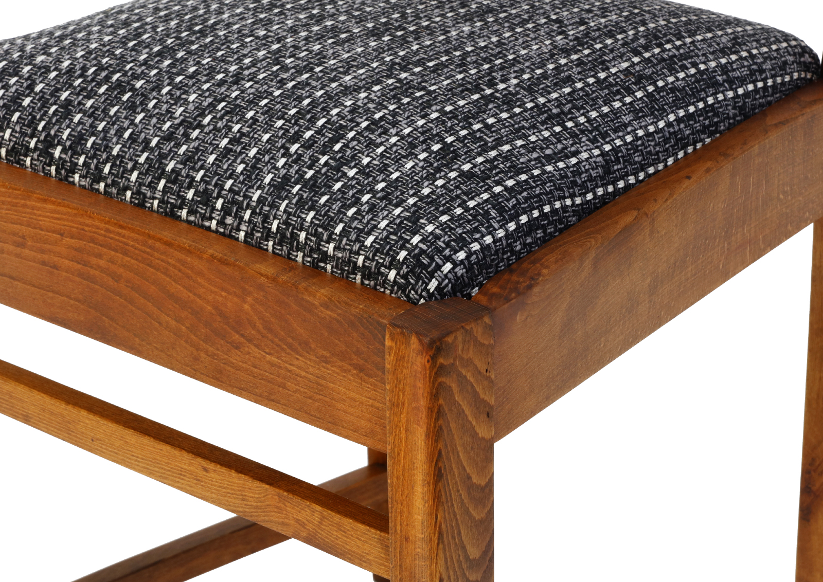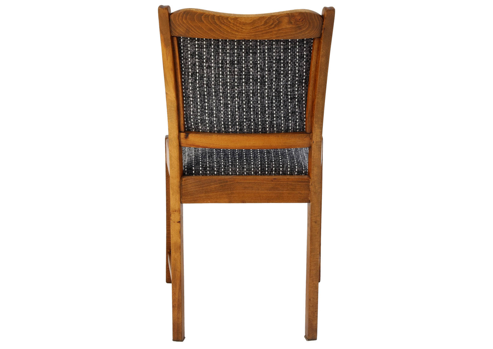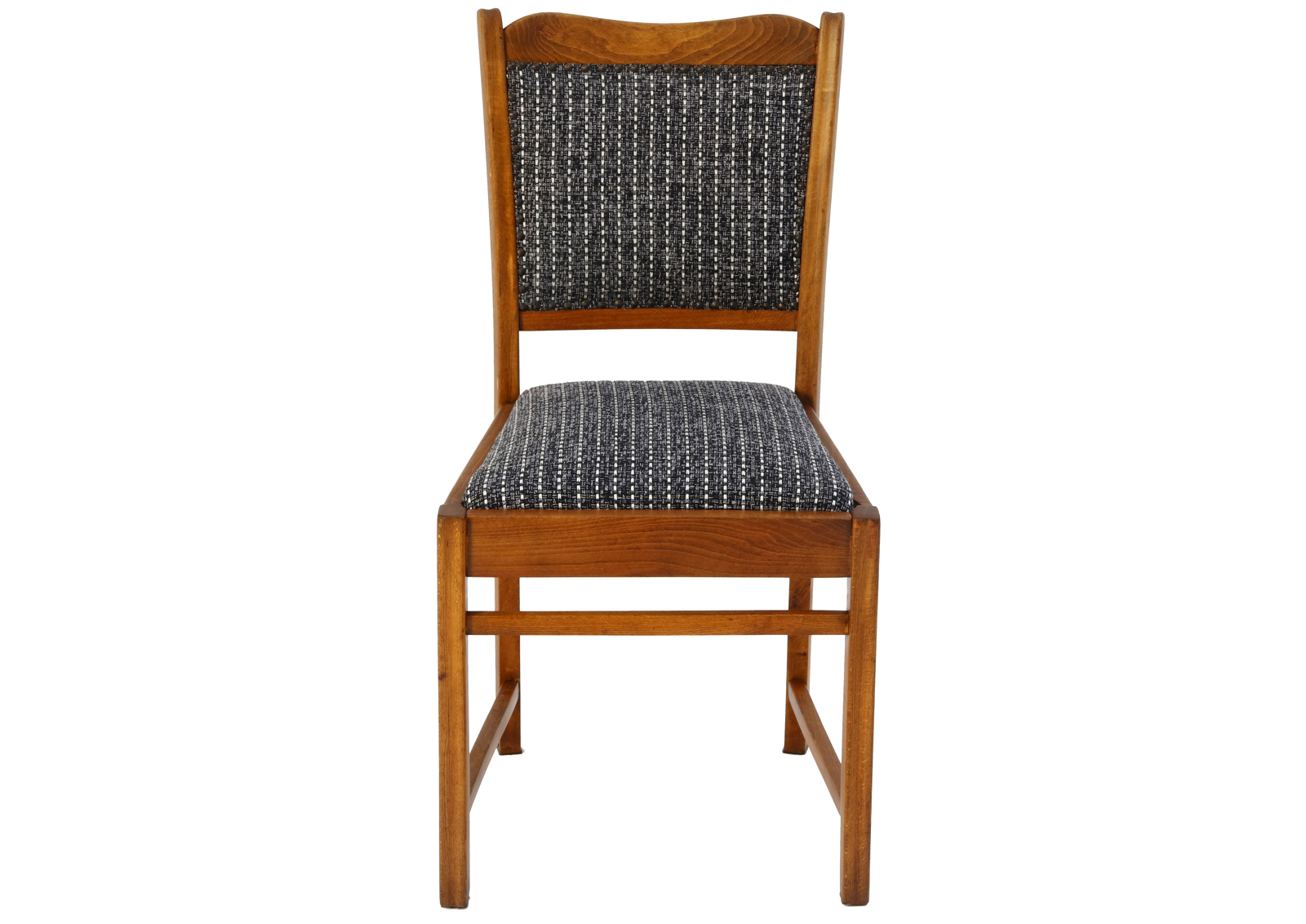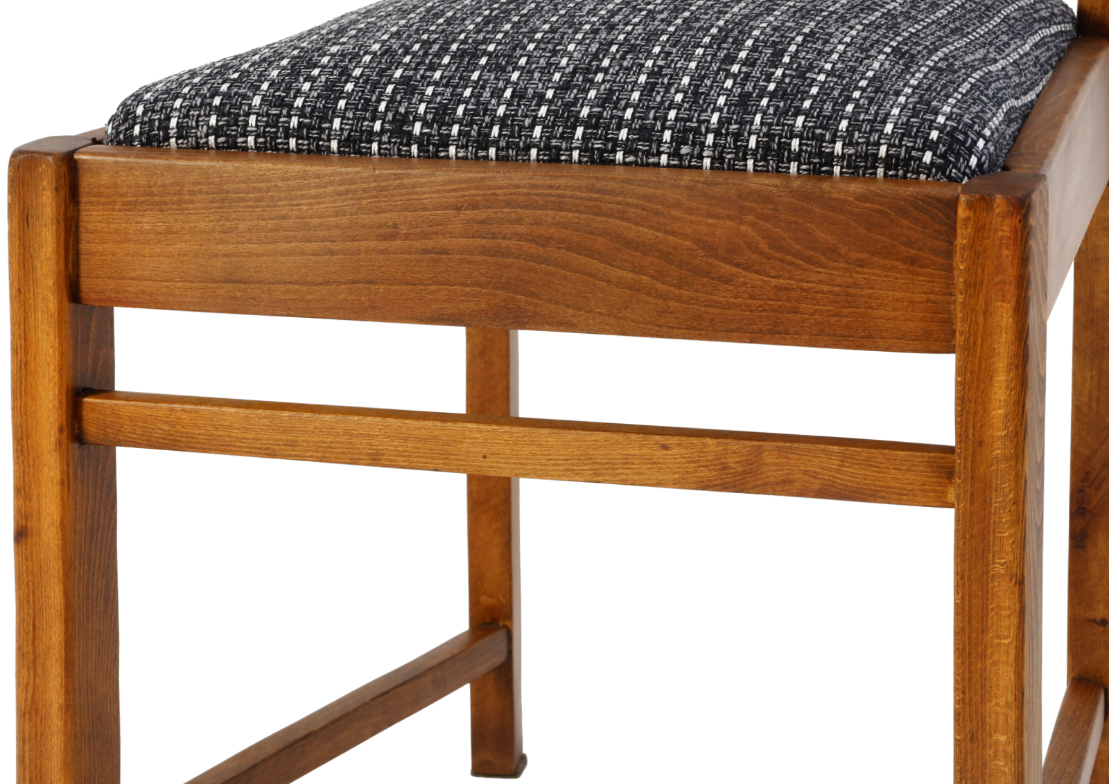 Made of beech. The chairs have been disassembled, the old coats of varnish fully removed, the armchair has then been glued together again, treated with Chinese natural and eco-friendly oil. New upholstery, foam, webbing, and interfacing, springs reattached. High quality fabric, durable, able to withstand 20 000 double rubs. Internal scaffolding sanded down thoroughly, coated with a protective layer. Very comfortable, well-shaped. Ideal dinner table chairs.