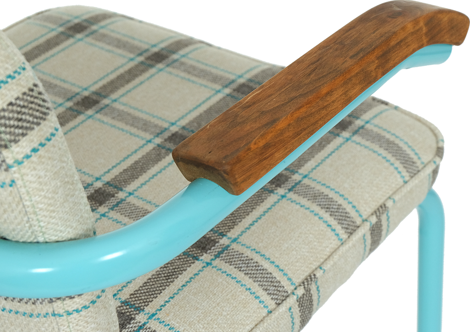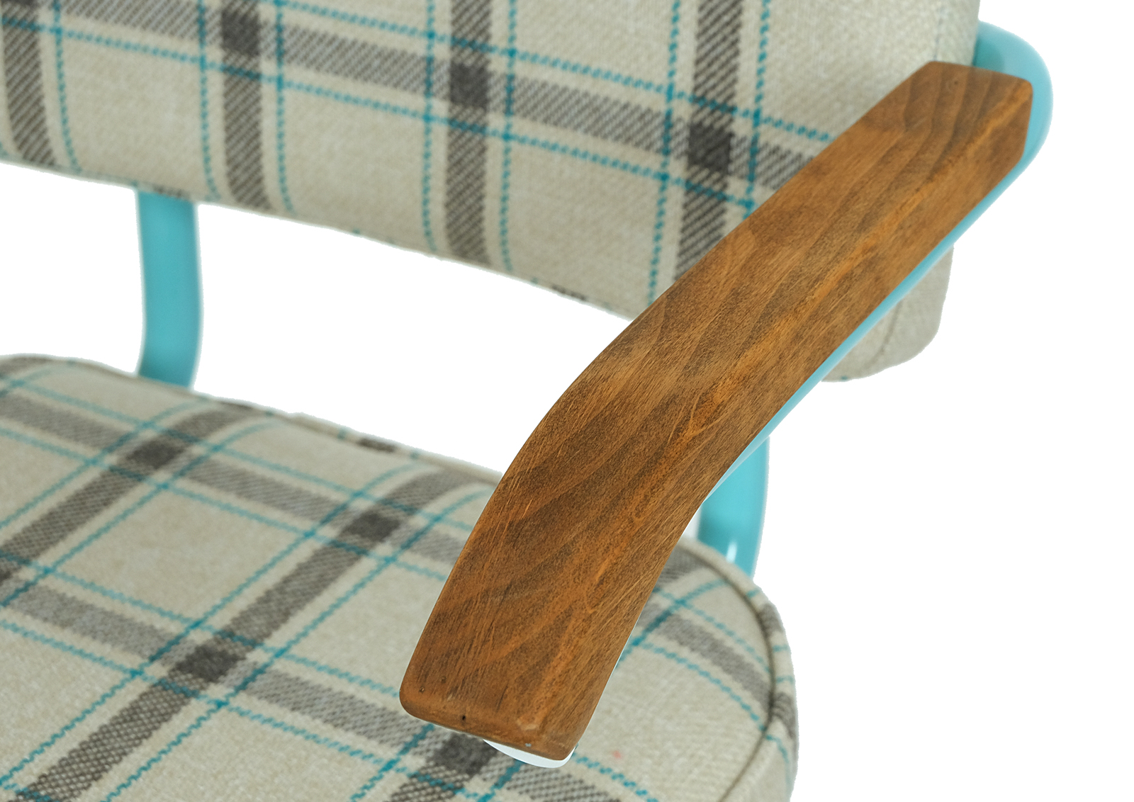 The chair has been completely disassembled, the wood was cleaned of old paint coatings, protected with oil based on natural Chinese oils, environmentally friendly. Beech wood. All metal elements have been cleaned, sandblasted and painted with powder paint fired at high temperature. New upholstery and high quality upholstery foam. Tubes in the base taped with felt.
