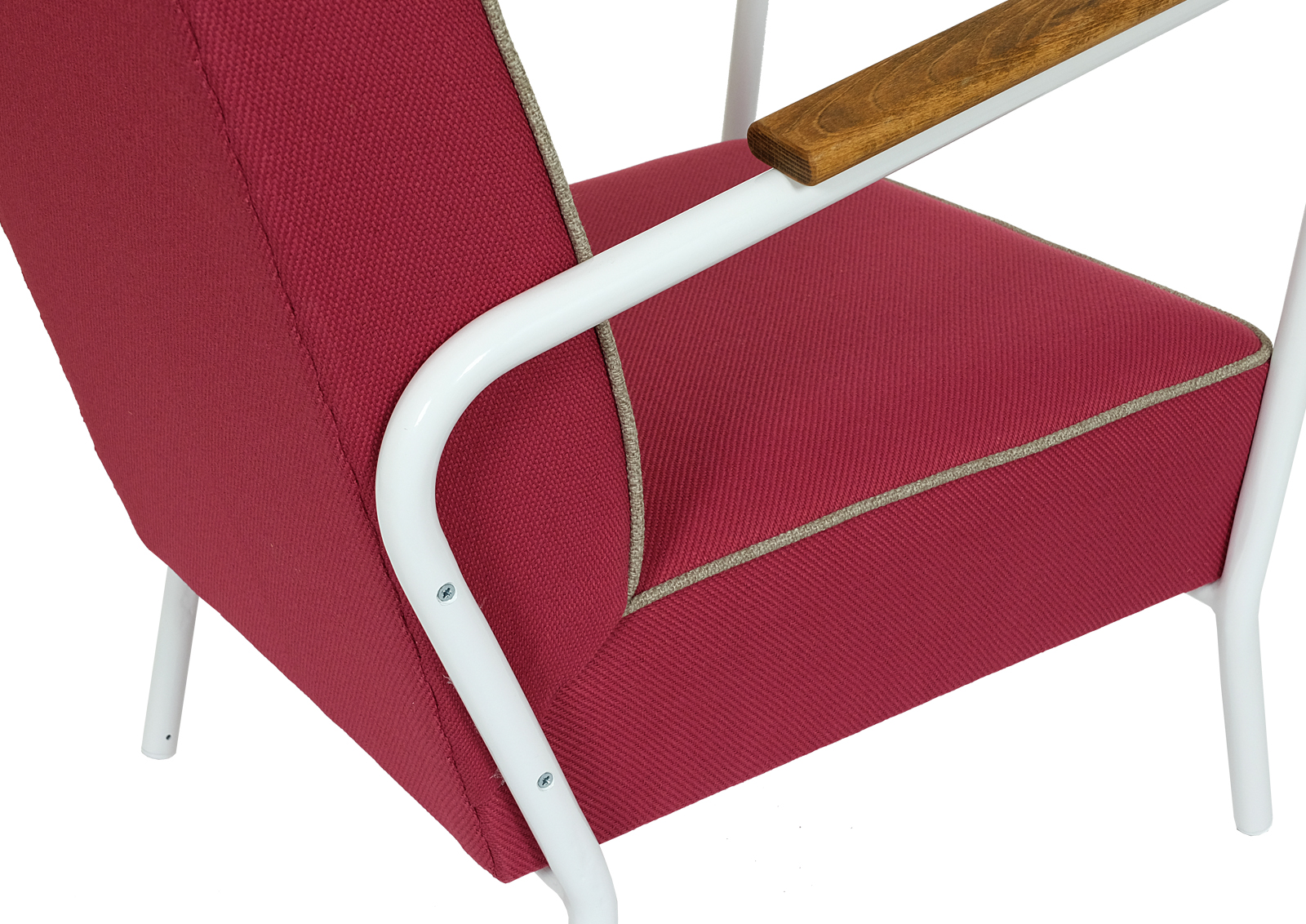 Fotel został całkowicie rozebrany, drewno oczyszczone ze starych powłok lakierniczych, zabezpieczony olejem na bazie naturalnych olei chińskich, przyjaznym dla środowiska. Drewno bukowe. Wszystkie elementy metalowe zostały oczyszczone, wypiaskowane i pomalowane farbą proszkową wypalaną w wysokiej temperaturze. Nowa tapicerka i gąbka o wysokiej gęstości. Nóżki w podstawie podklejone filcem. Ręcznie szyty. Bardzo dobrej jakości tkanina, odporność na ścieranie