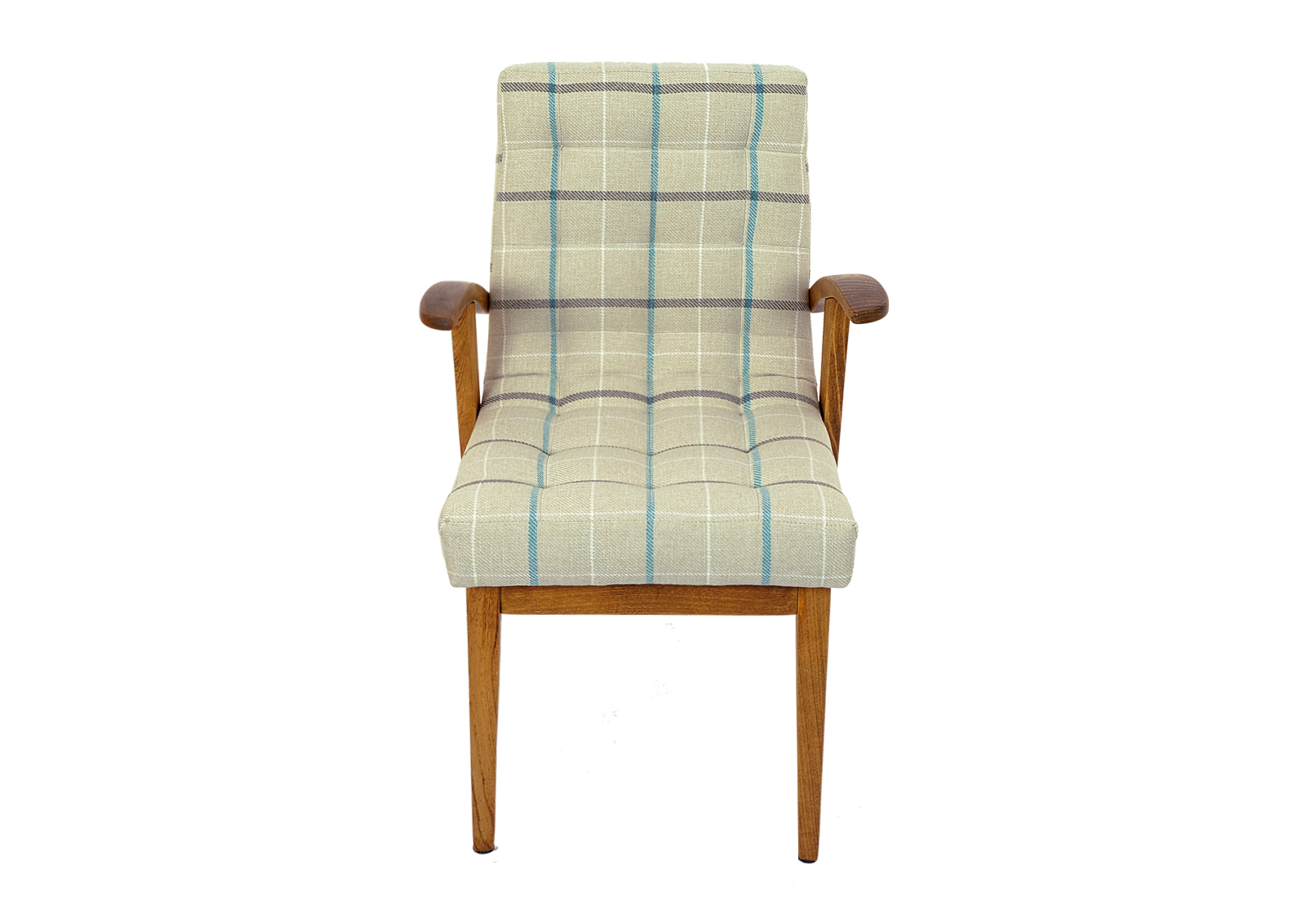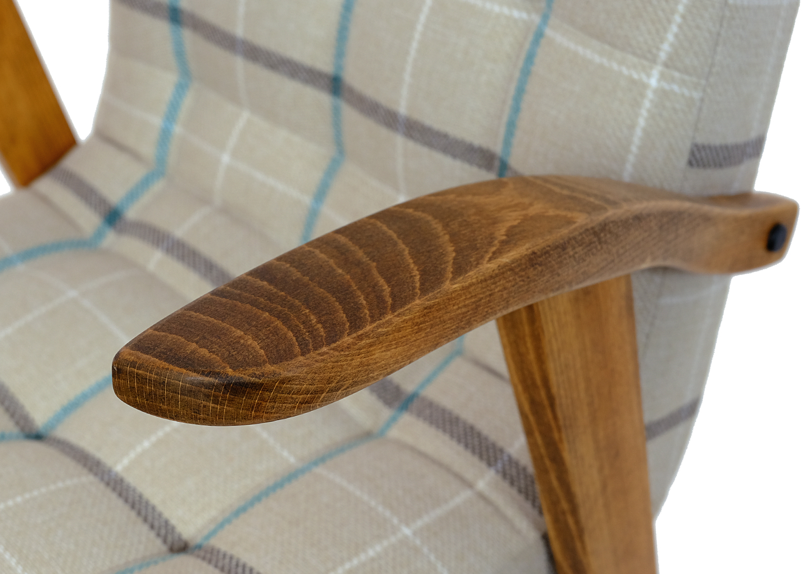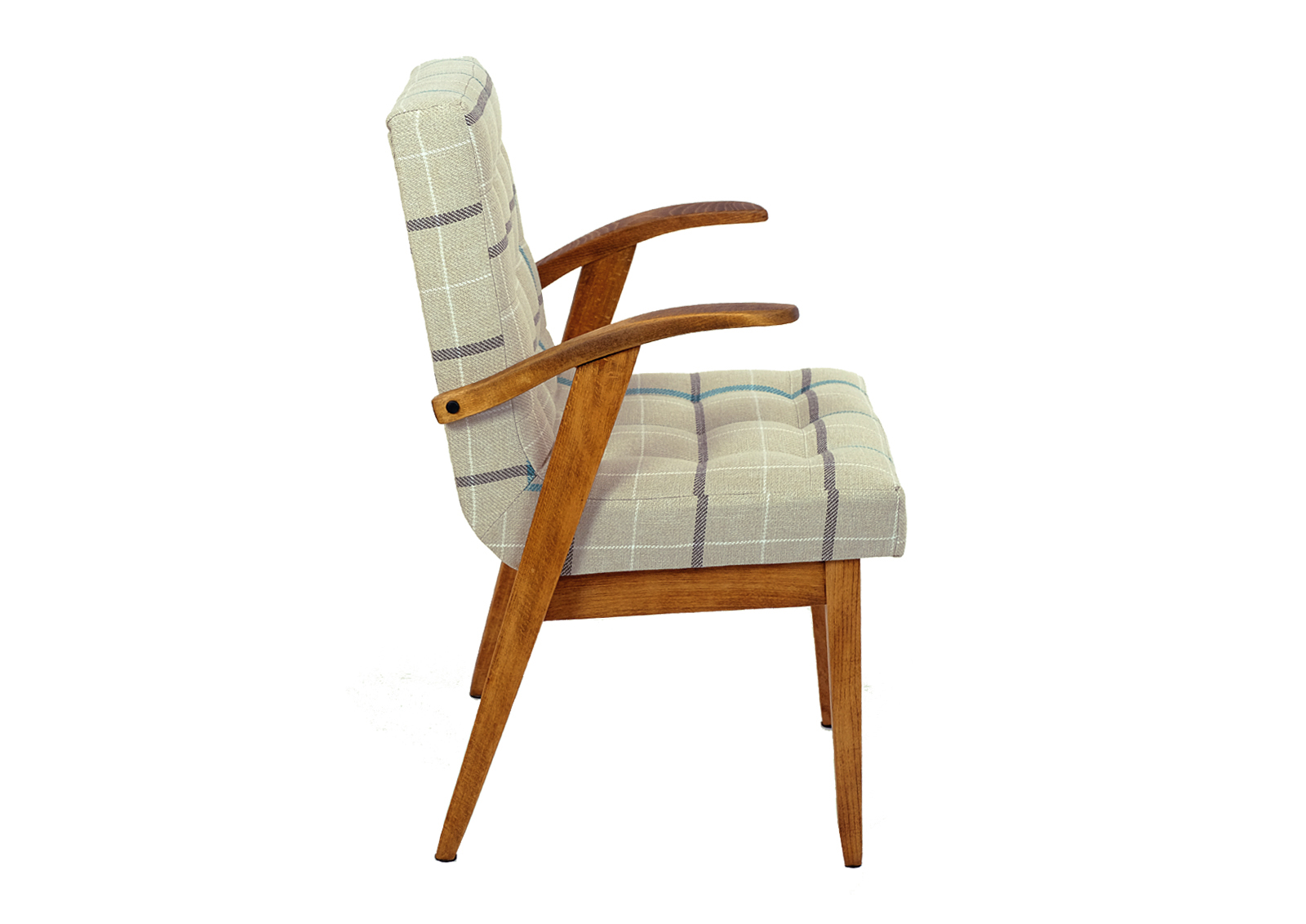 Zrobiony z drewna bukowego. Fotelik został całkowicie rozebrany, drewno oczyszczone ze starych powłok, ponownie sklejony, zabezpieczony olejem na bazie naturalnych olei chińskich, przyjaznym dla środowiska. Nowa tapicerka, wymieniona gąbka, pasy, fizelina. Ręcznie szyty. Dobrej jakości tkanina, odporność na ścieranie 20 000 suwów. Szkielet wewnątrz oczyszczony dokładnie papierem, zabezpieczony. Pikowane siedzisko sprawia że fotelik wygląda wytwornie.  Wszystkie nóżki podklejone dobrej jakości filcem. Kultowy model fotela PRL.