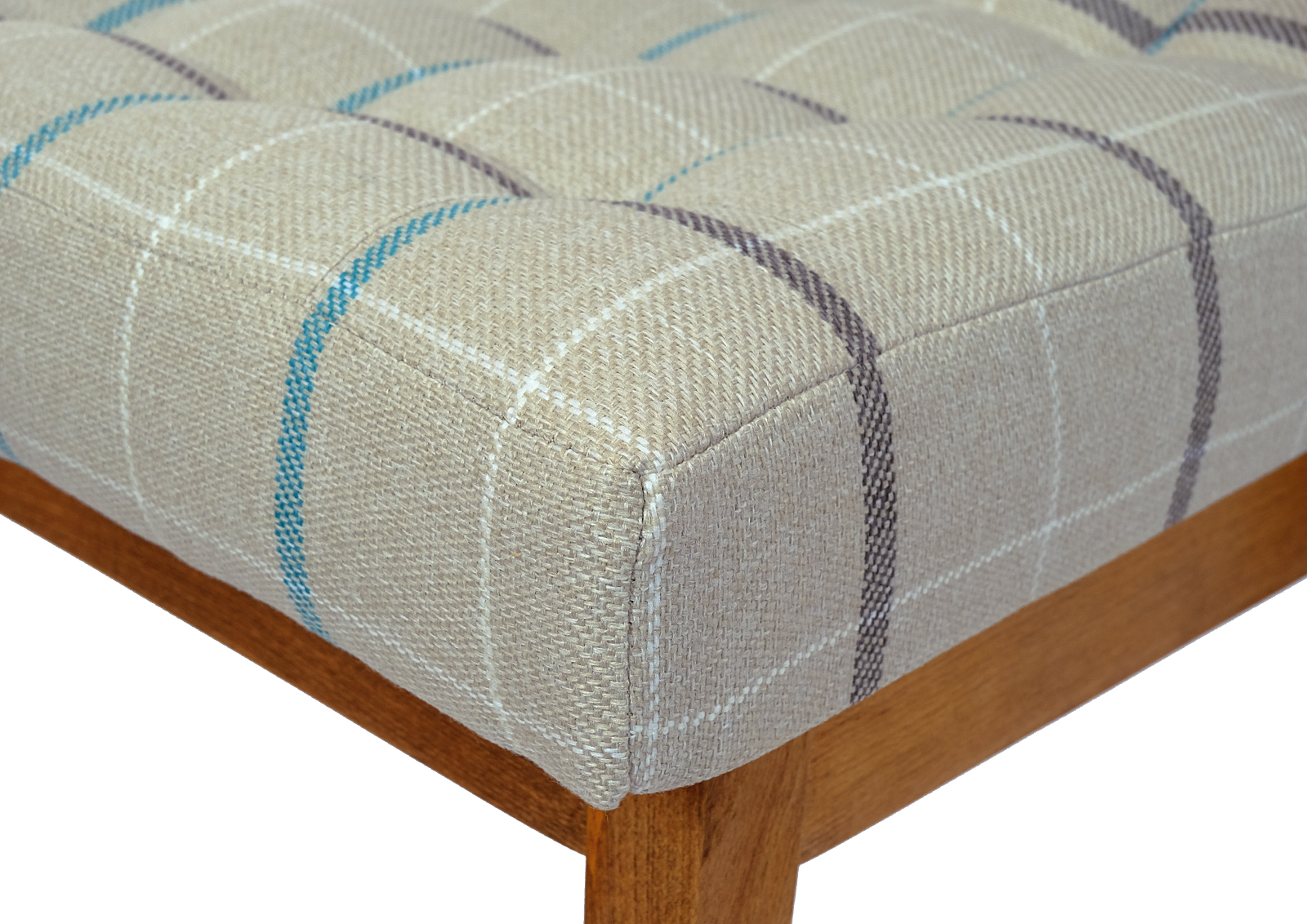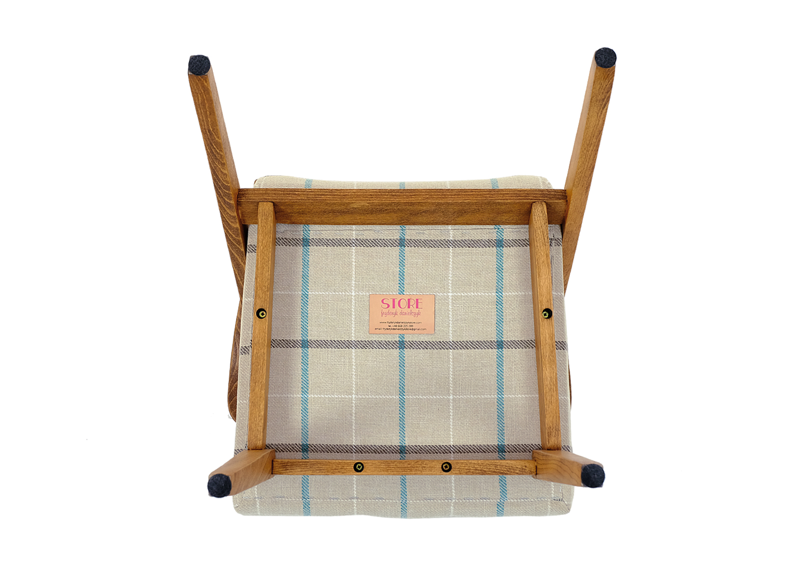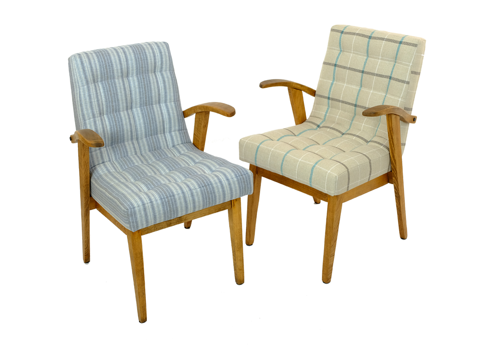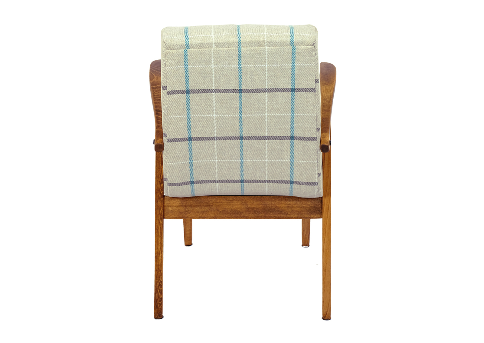Zrobiony z drewna bukowego. Fotelik został całkowicie rozebrany, drewno oczyszczone ze starych powłok, ponownie sklejony, zabezpieczony olejem na bazie naturalnych olei chińskich, przyjaznym dla środowiska. Nowa tapicerka, wymieniona gąbka, pasy, fizelina. Ręcznie szyty. Dobrej jakości tkanina, odporność na ścieranie 20 000 suwów. Szkielet wewnątrz oczyszczony dokładnie papierem, zabezpieczony. Pikowane siedzisko sprawia że fotelik wygląda wytwornie.  Wszystkie nóżki podklejone dobrej jakości filcem. Kultowy model fotela PRL.