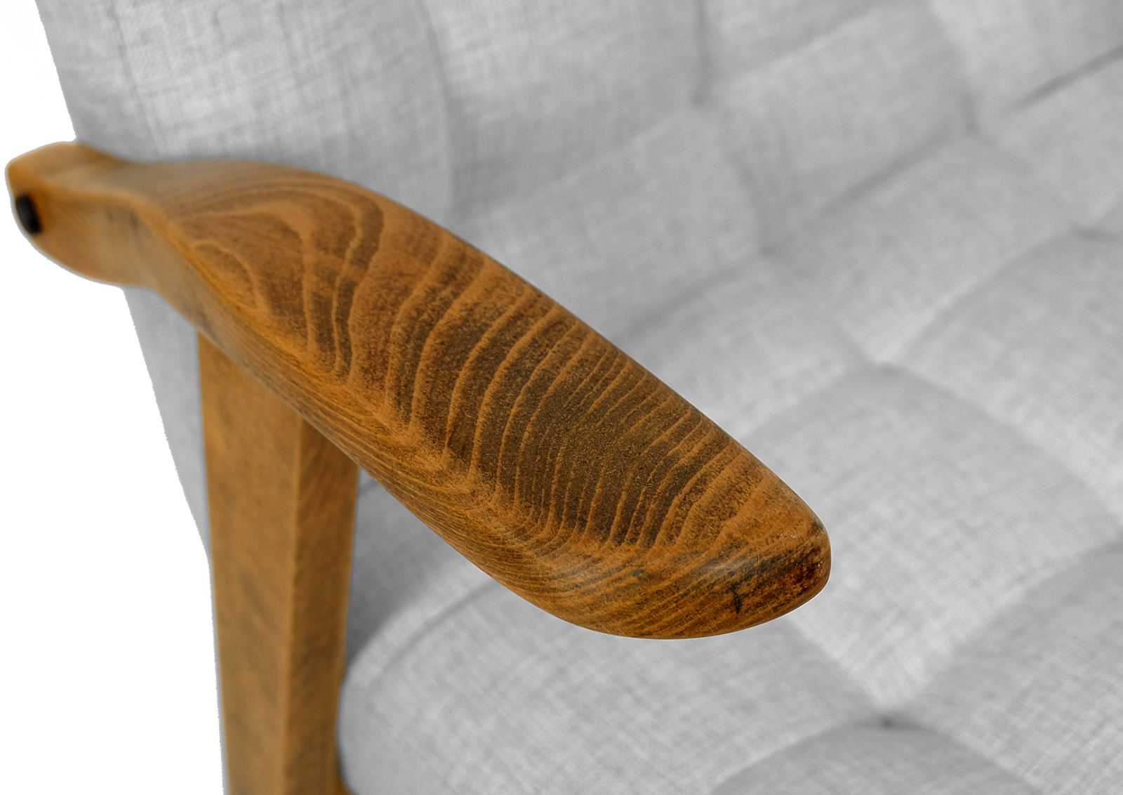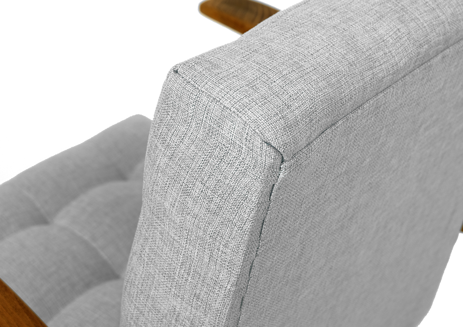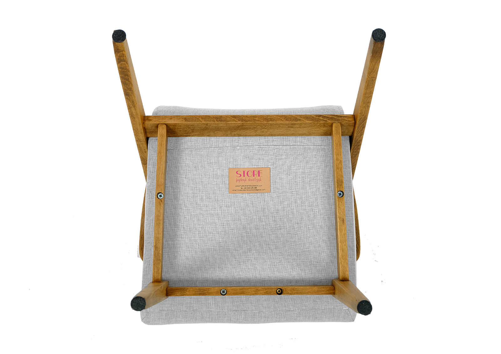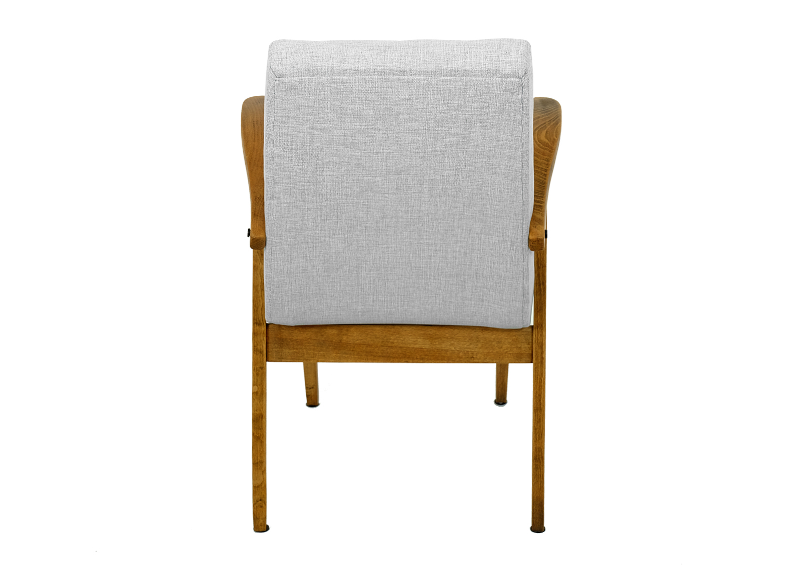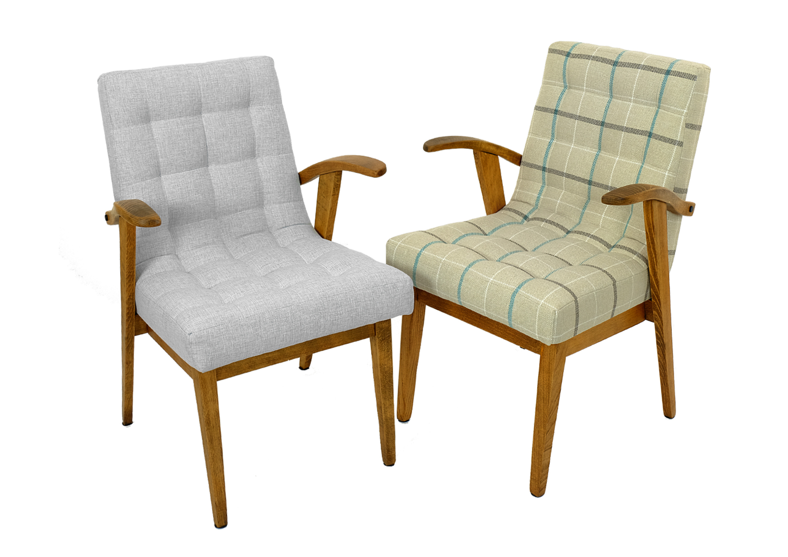 Zrobiony z drewna bukowego. Fotelik został całkowicie rozebrany, drewno oczyszczone ze starych powłok, ponownie sklejony, zabezpieczony olejem na bazie naturalnych olei chińskich, przyjaznym dla środowiska. Nowa tapicerka, wymieniona gąbka, pasy, fizelina. Ręcznie szyty. Dobrej jakości tkanina, odporność na ścieranie 20 000 suwów. Szkielet wewnątrz oczyszczony dokładnie papierem, zabezpieczony. Pikowane siedzisko sprawia że fotelik wygląda wytwornie. Wszystkie nóżki podklejone dobrej jakości filcem. Kultowy model fotela PRL.