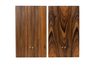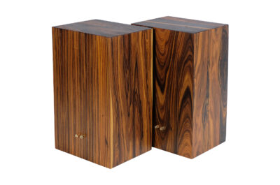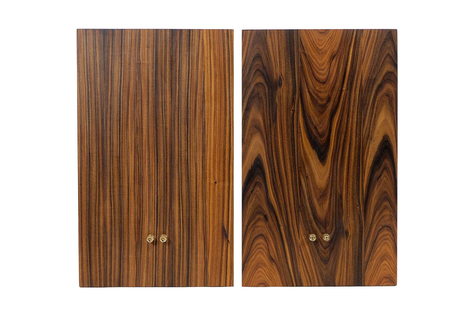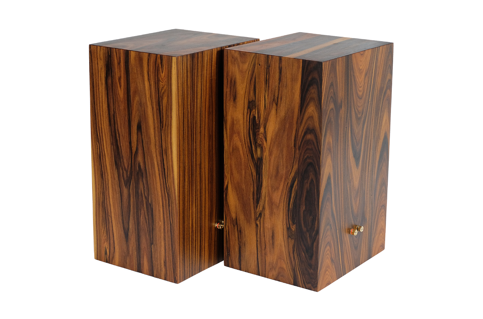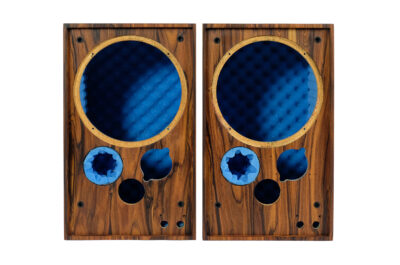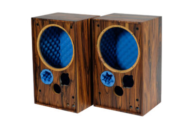 Oryginalne obudowy z lat 70tych po renowacji z wykorzystaniem materiałów najwyższej jakości. W tym projekcie zastosowano jeden z najpiękniejszych i najbardziej ekskluzywnych rodzajów drewna ozdobnego – palisander. Zostało ono precyzyjnie wykończone olejem chińskim produkowanym na bazie naturalnych olei oraz naturalnym woskiem pszczelim na bazie terpentyny. Dzięki temu podkreślono oryginalną strukturę i odcień drewna, a obudowy są dobrze zabezpieczone i bardzo miłe w dotyku. Zadbano o każdy detal wykończenia. Profesjonalna gąbka akustyczna oraz nowe maskownice w charakterystycznym dla JBL odcieniu niebieskiego pięknie komponują się z palisandrem. W zestawie znajdują się również standardowe naklejki z nazwą modelu. Obudowy zostały wyposażone w nowe terminale głośnikowe.