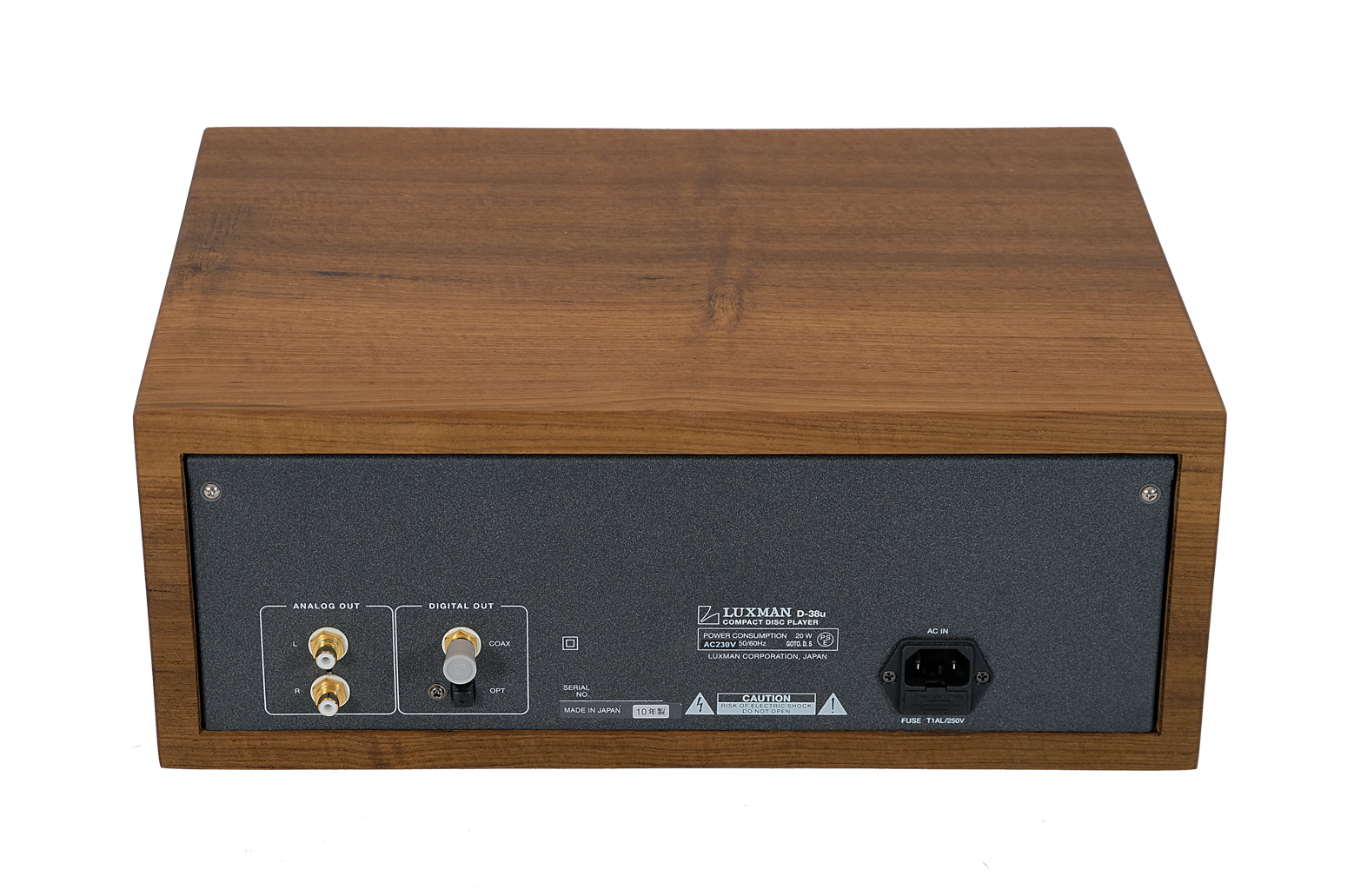 Luxman D-38u to ekskluzywny odtwarzacz CD wyprodukowany w Japonii w grudniu 2009 r. Został wyposażony w nowoczesne obwody cyfrowe i technologie analogowe sprawdzone w serii D. W odróżnieniu od pozostałych playerów Luxmana D-38u został dopasowany stylistycznie i brzmieniowo do wzmacniacza 38u – chodzi przede wszystkim o “old schoolowy” design, a więc drewnianą obudowę, przedni panel stylizowany na lata 70′ oraz użycie w układzie wzmacniającym lamp próżniowych. Model ten wyposażony jest w funkcję przełączania wyjścia na obwód lampowy (ECC82) i obwód półprzewodnikowy. Dzięki zastosowaniu wysokiej jakości przetwornika cyfrowo-analogowego zawierającego 24-bitowy, 192-kilohercowy układ DAC PCM1754 Burr-Brown można uzyskać lampowe brzmienie, ciepłe i niezwykle przyjemne dla ucha. Mechanizm napędowy jest wsparty na grubej 15-milimetrowej płycie bazowej z czystego aluminium w celu zwiększenia stabilności i zmniejszenia drgań. Piękna klasyczna obudowa nawiązuje w swojej formie do kultowego zintegrowanego wzmacniacza lampowego SQ-38u. Elegancki minimalistyczny panel przedni został wykonany ze szczotkowanego aluminium o grubości 8-milimetrów, co zwiększa sztywność obudowy. Duży, łatwy do odczytania wyświetlacz oferuje 3-stopniową funkcję ściemniacza (regulacja jasności)