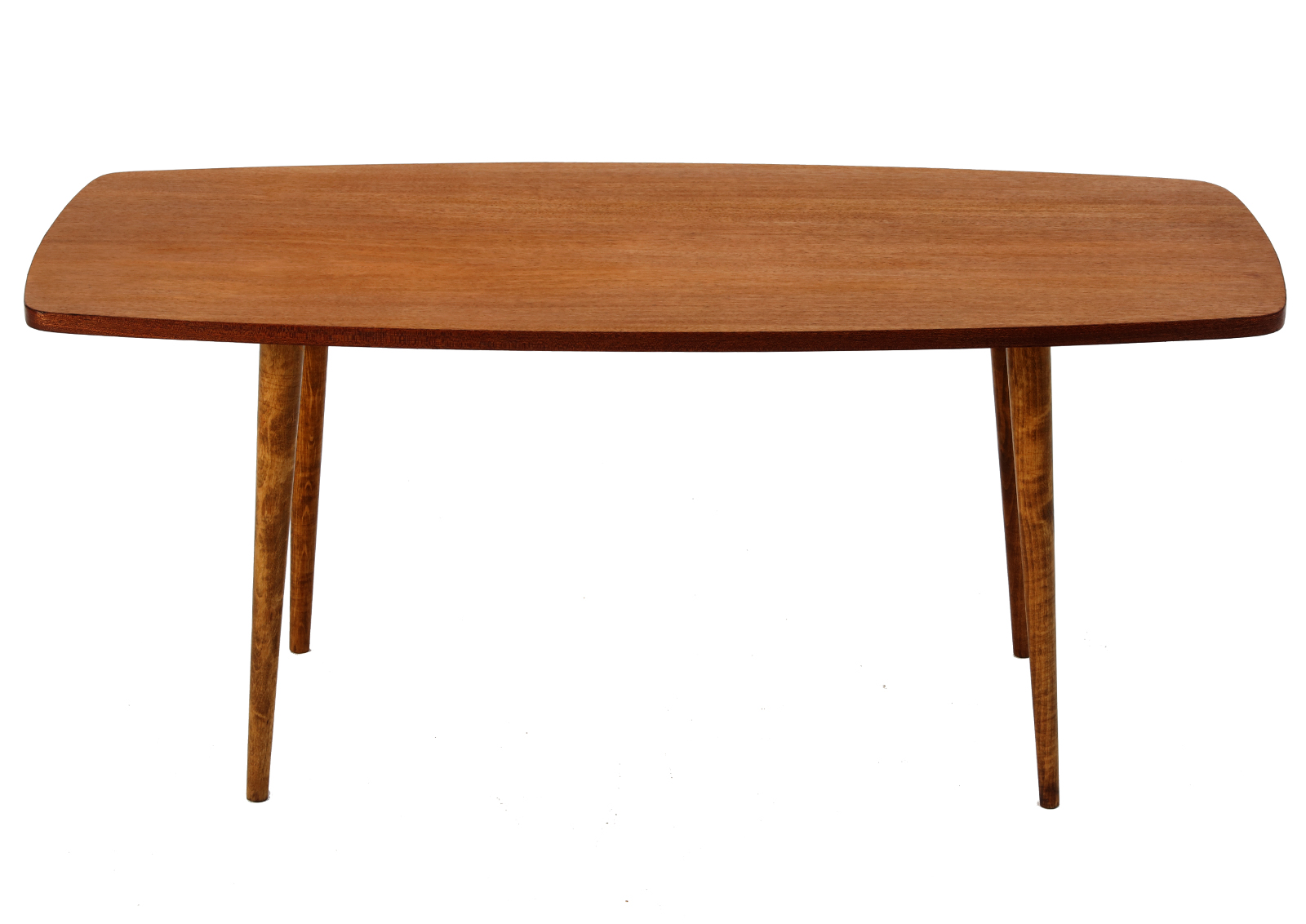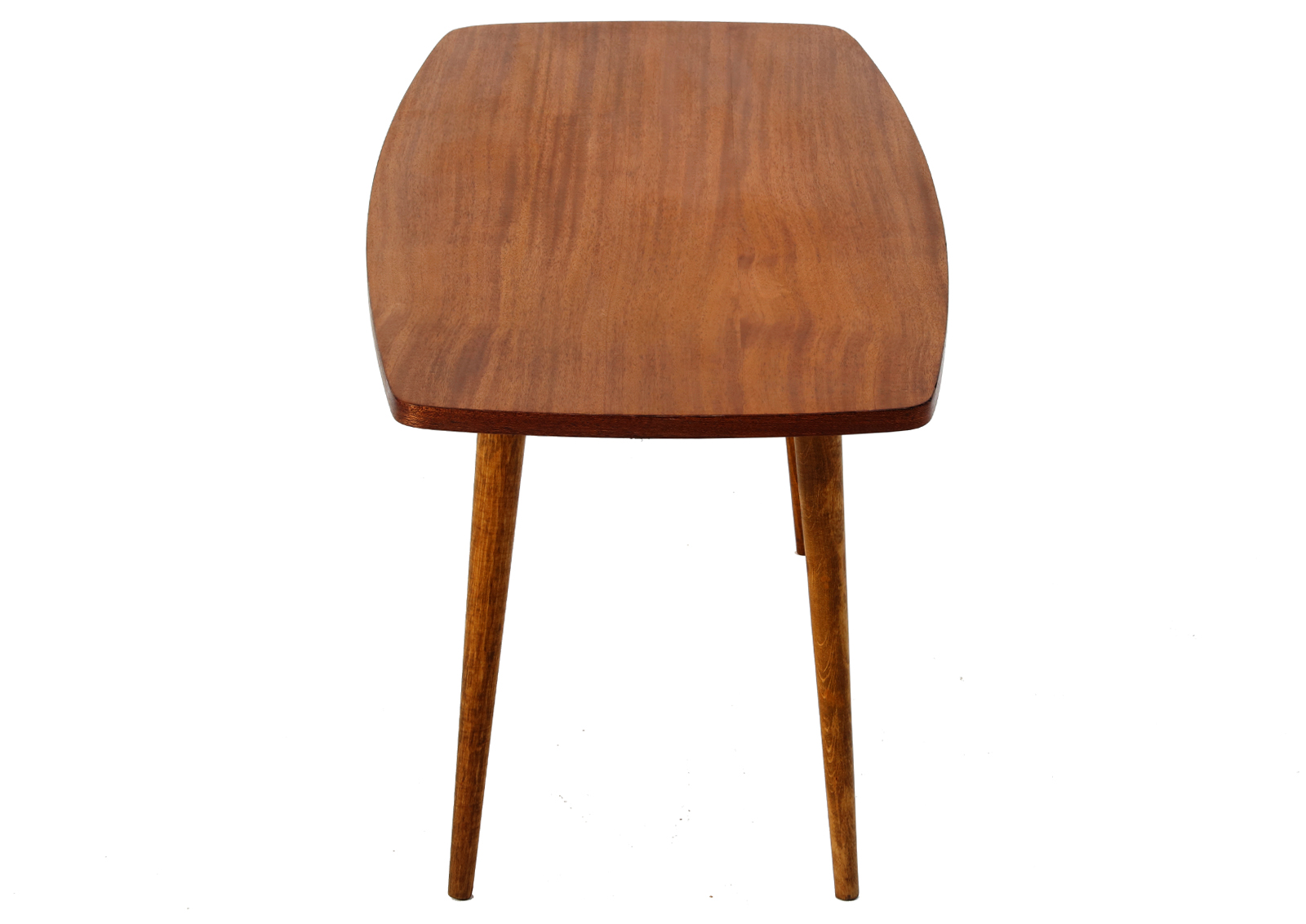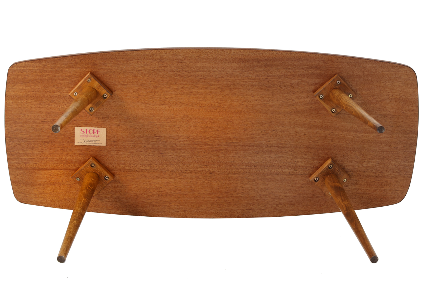 Ława kawowa PRL, patyczak (jamnik), po całkowitej rewitalizacji. Ława została całkowicie oczyszczona ze starych powłok lakierniczych. Oklejona obłogiem mahoniowym, nogi wykonane są z drewna bukowego. Zabezpieczona olejem na bazie naturalnych olei chińskich, przyjaznym dla środowiska. Blat woskowany, odporny na działanie wody. Porządny, stabilny mebel z odkręcanymi nóżkami osadzonymi w drewnianych mocowaniach. Kultowy model ławy PRL.