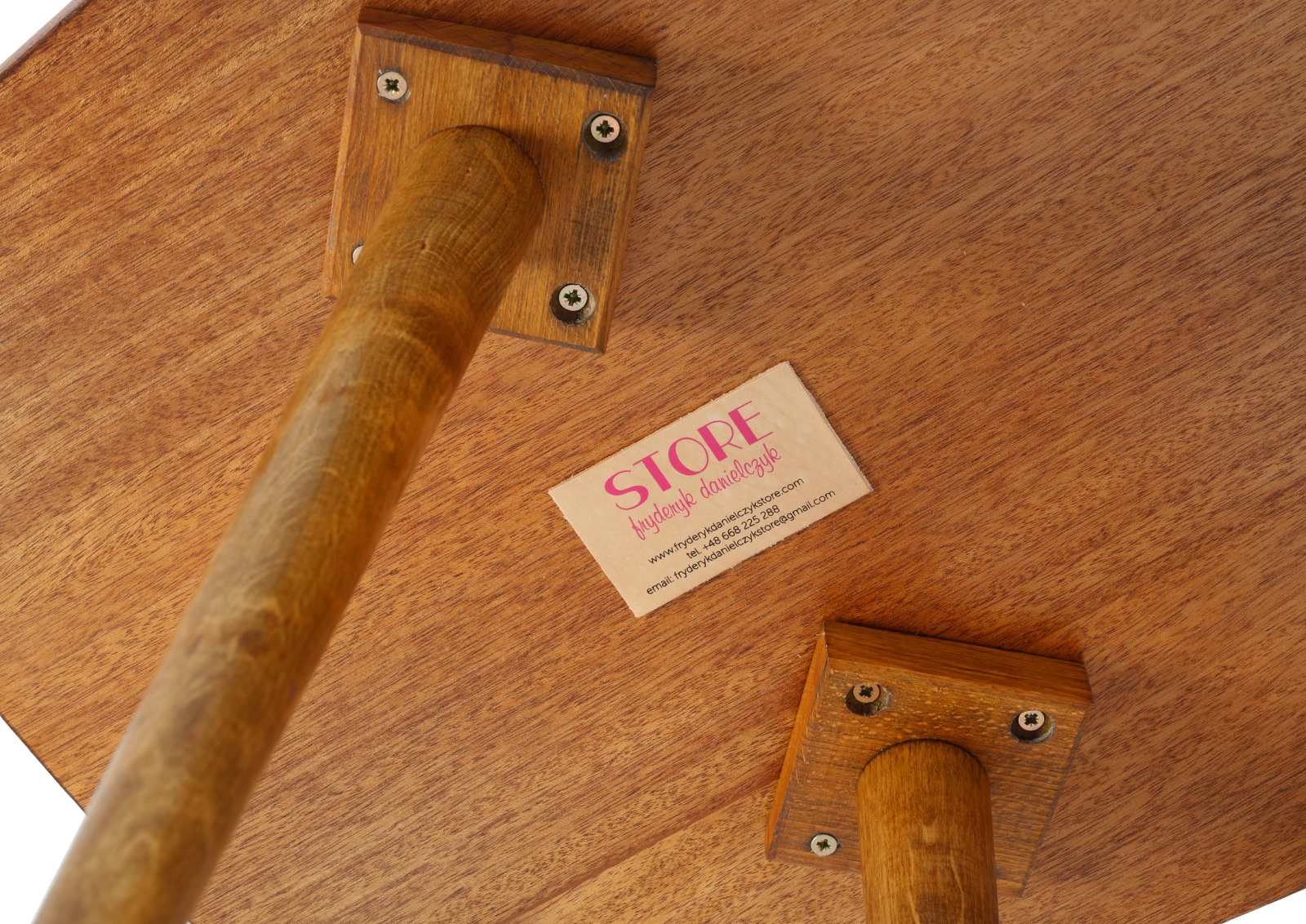 Wyprodukowany w Obornickich Fabrykach Mebli w Obornikach Wielkopolskich. Zjednoczenie Przemysłu Meblarskiego.