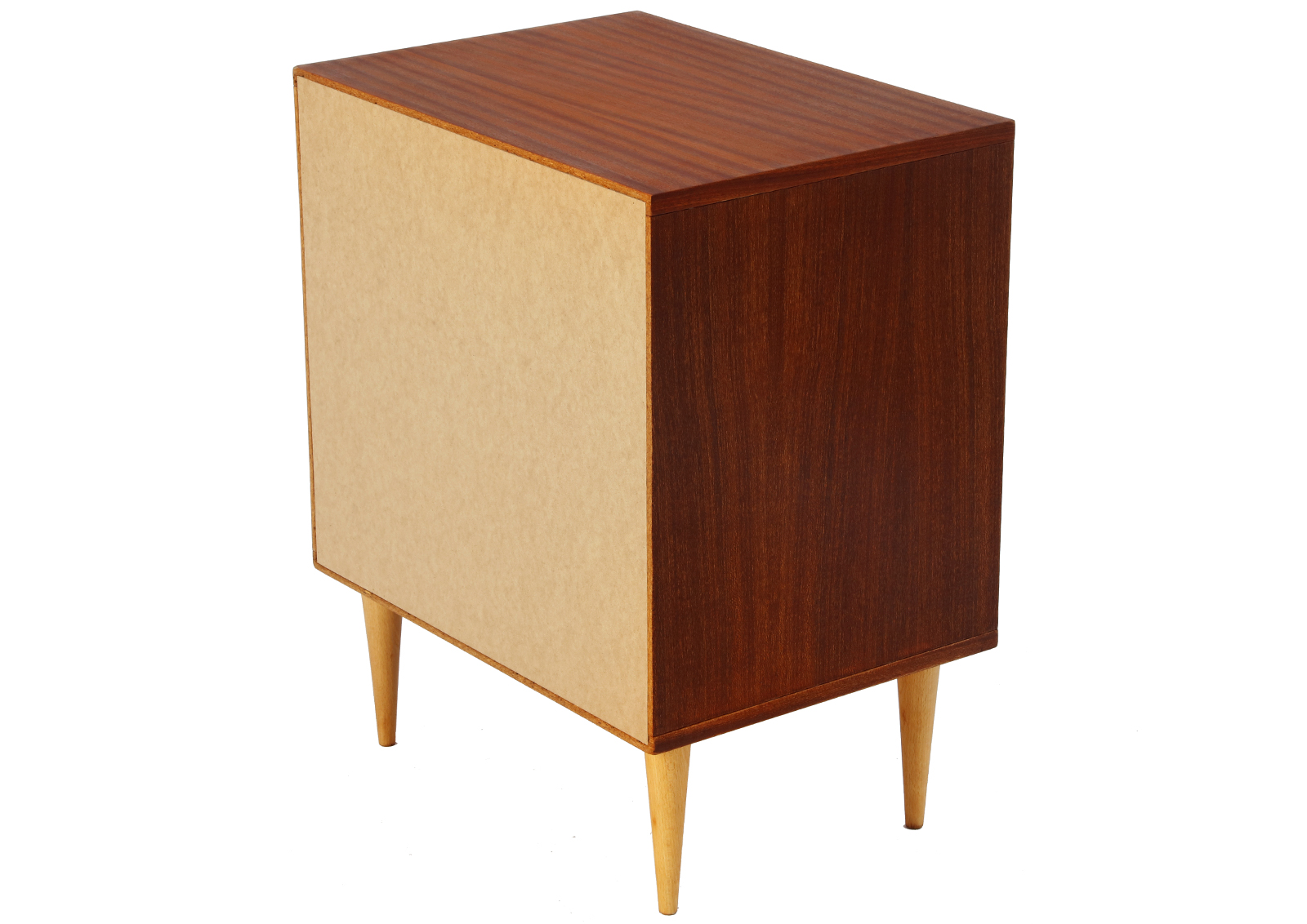Szafka RTV W-465/N-I/3, po całkowitej rewitalizacji. Szafka została całkowicie oczyszczona ze starych powłok lakierniczych. Oklejona mahoniem, nogi bukowe. Zabezpieczona olejem na bazie naturalnych olei chińskich, przyjaznym dla środowiska. Nowa tylna ściana z płyty pilśniowej.