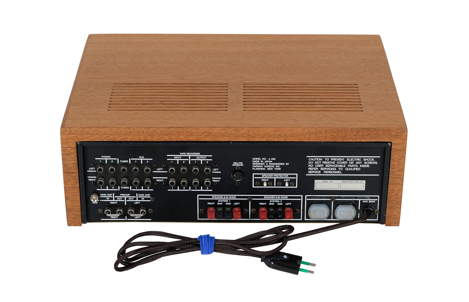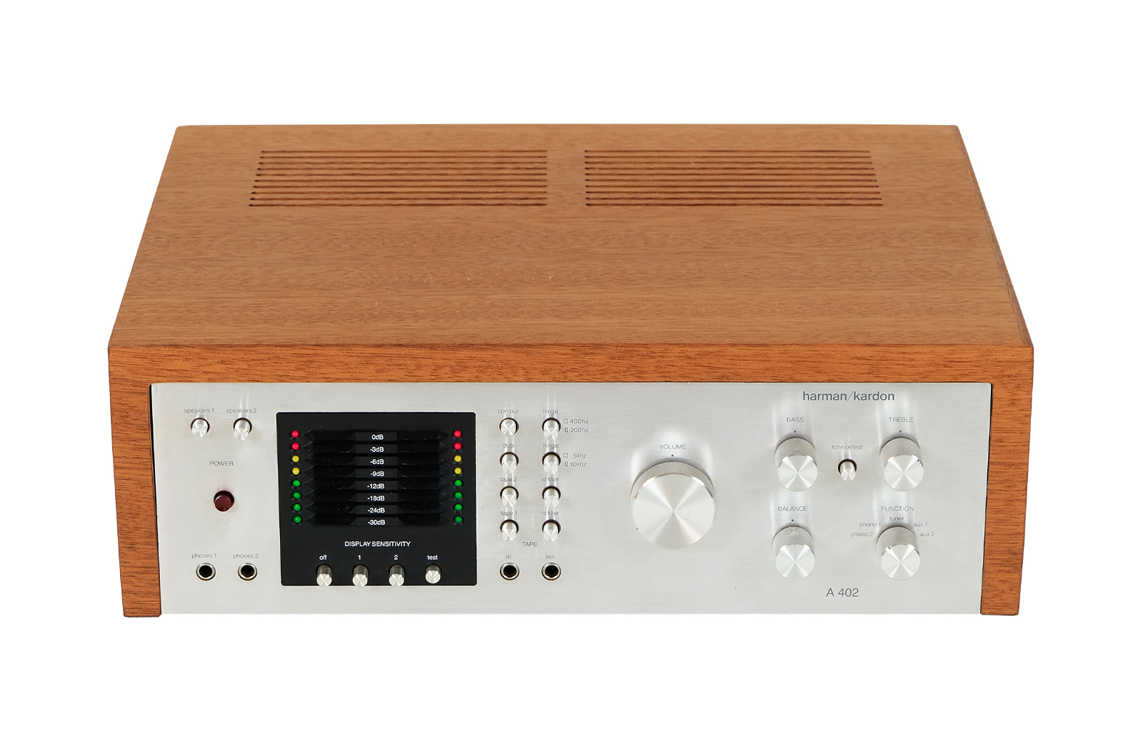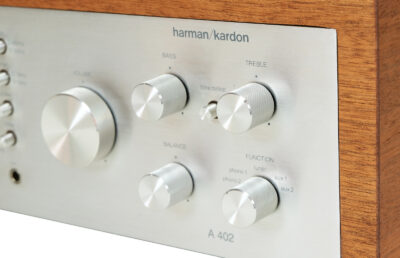 A 402 to wzmacniacz produkowany w drugiej połowie lat 70tych przez Harman Kardon jako element wysokiej jakości systemu audio. Model ten został zaprojektowany, aby zapewnić “bezkompromisową reprodukcję muzyki dla Twojej przyjemności”. Wzmacniacz wyposażony został w charakterystyczny wyświetlacz o wyjątkowej czułości oraz srebrny panel z prostymi przyciskami. Model ten zapewnia naturalne brzmienie oraz dynamiczne doły. Scena muzyczna jest szeroka i pełna detali.