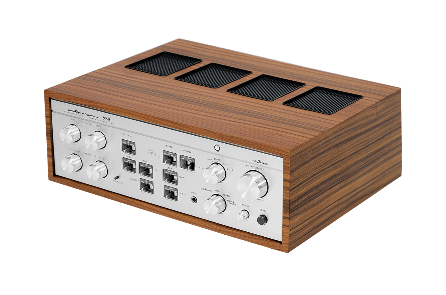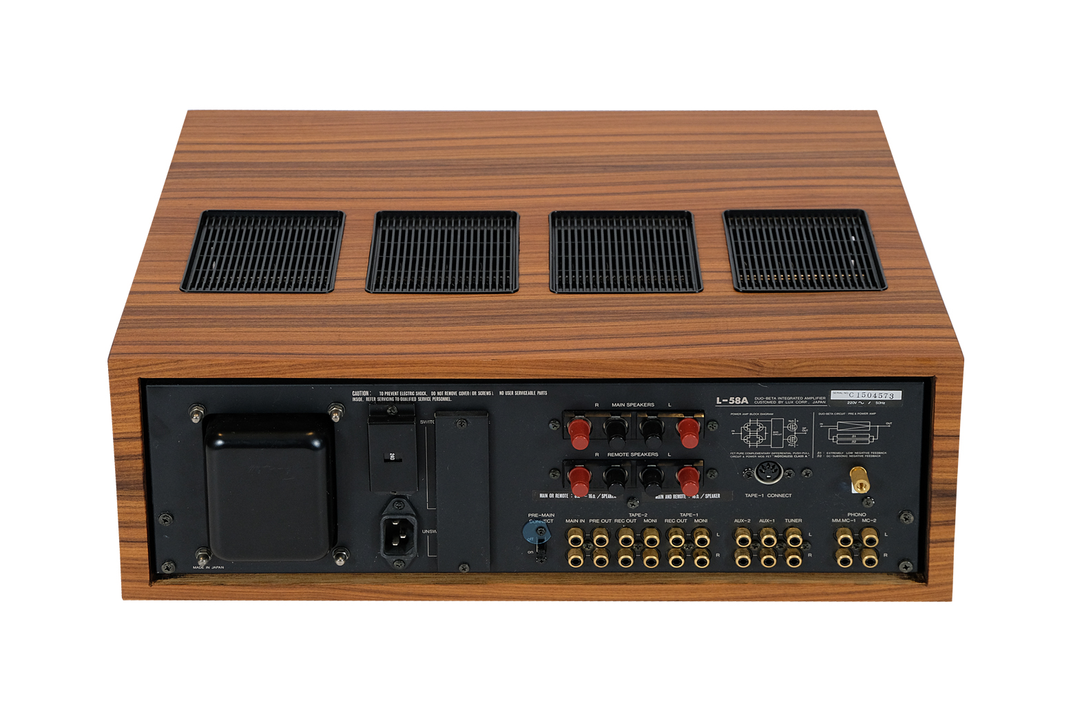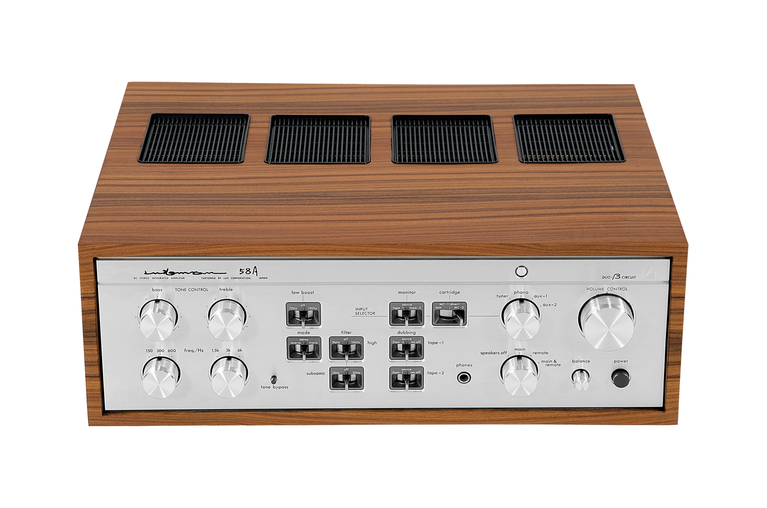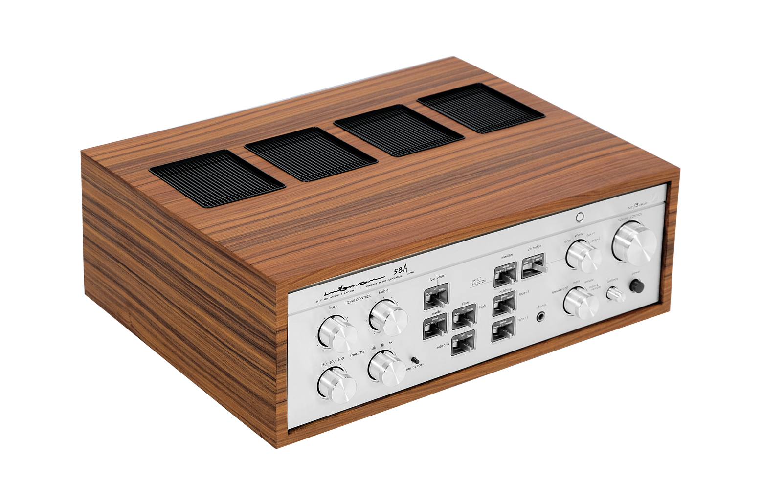LUXMAN L-58A to wyjątkowy zintegrowany wzmacniacz  wyprodukowany w 1979 roku czyli “złotej erze” japońskiego sprzętu audio. Ten model został wyposażony w słynny, przełomowy układ Duo Beta Circuit, poprawiający jakość dźwięku i minimalizujący zniekształcenia. Sekcja wzmacniacza mocy oparta na tranzystorach MOS FET gwarantuje moc 100W na kanał przy 8 Ohm, z minimalnym poziomem zniekształceń harmonicznych wynoszącym zaledwie 0,015%. Model L-58A zapewnia dużą wygodę i efektywność użytkowania dzięki możliwości separacji przedwzmacniacza i wzmacniacza mocy, dwupozycyjnego podbicia niskich tonów oraz filtrom wysokotonowym i subsonicznym. Posiada także funkcje kopiowania i monitorowania taśmy w dwóch kierunkach, bypass barwy oraz charakterystyczny dla Luxmana dotykowy przycisk wyciszenia. Wysoka jakość komponentów zapewnia wyjątkową trwałość. To doskonały wybór dla wymagających użytkowników, którzy cenią zarówno estetykę, jak i doskonałą jakość dźwięku.