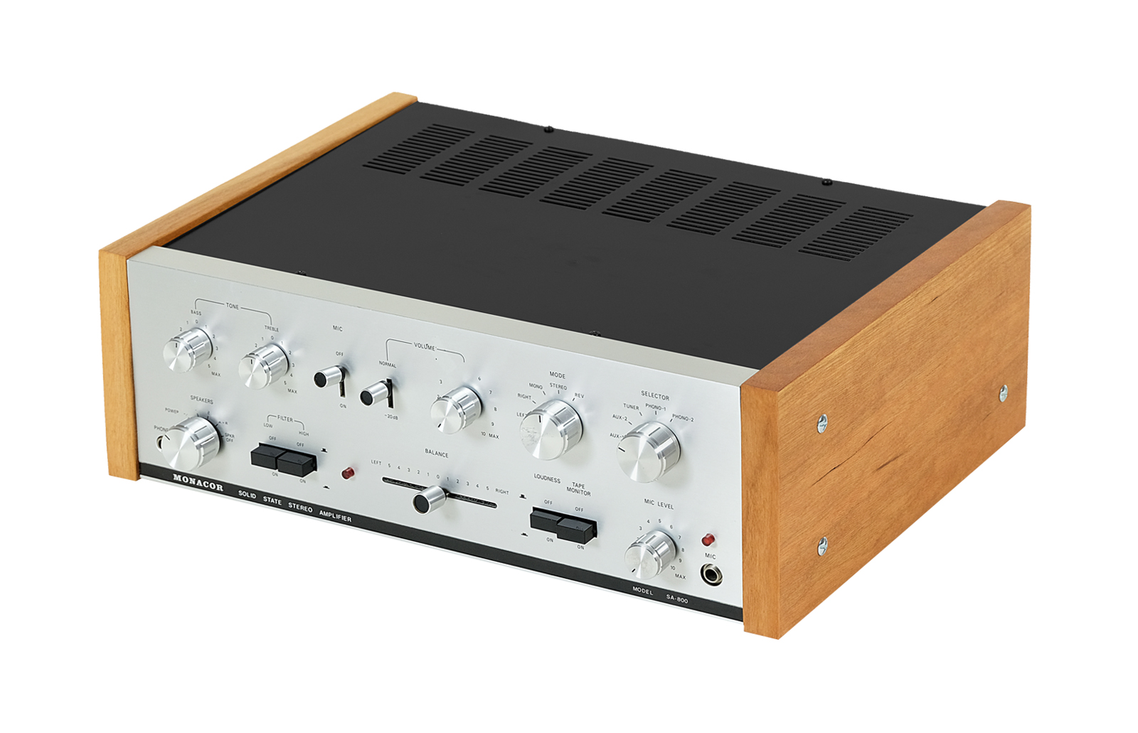 Solid State SA 800 to wzmacniacz Monacor z lat 70tych, który dzięki dobrym parametrom technicznym charakteryzuje się czystym i bardzo naturalnym brzmieniem. Warto zwrócić również uwagę na solidną konstrukcję tego modelu oraz na prostą, klasyczną formę panelu przedniego wykonanego ze szczotkowanego aluminium.