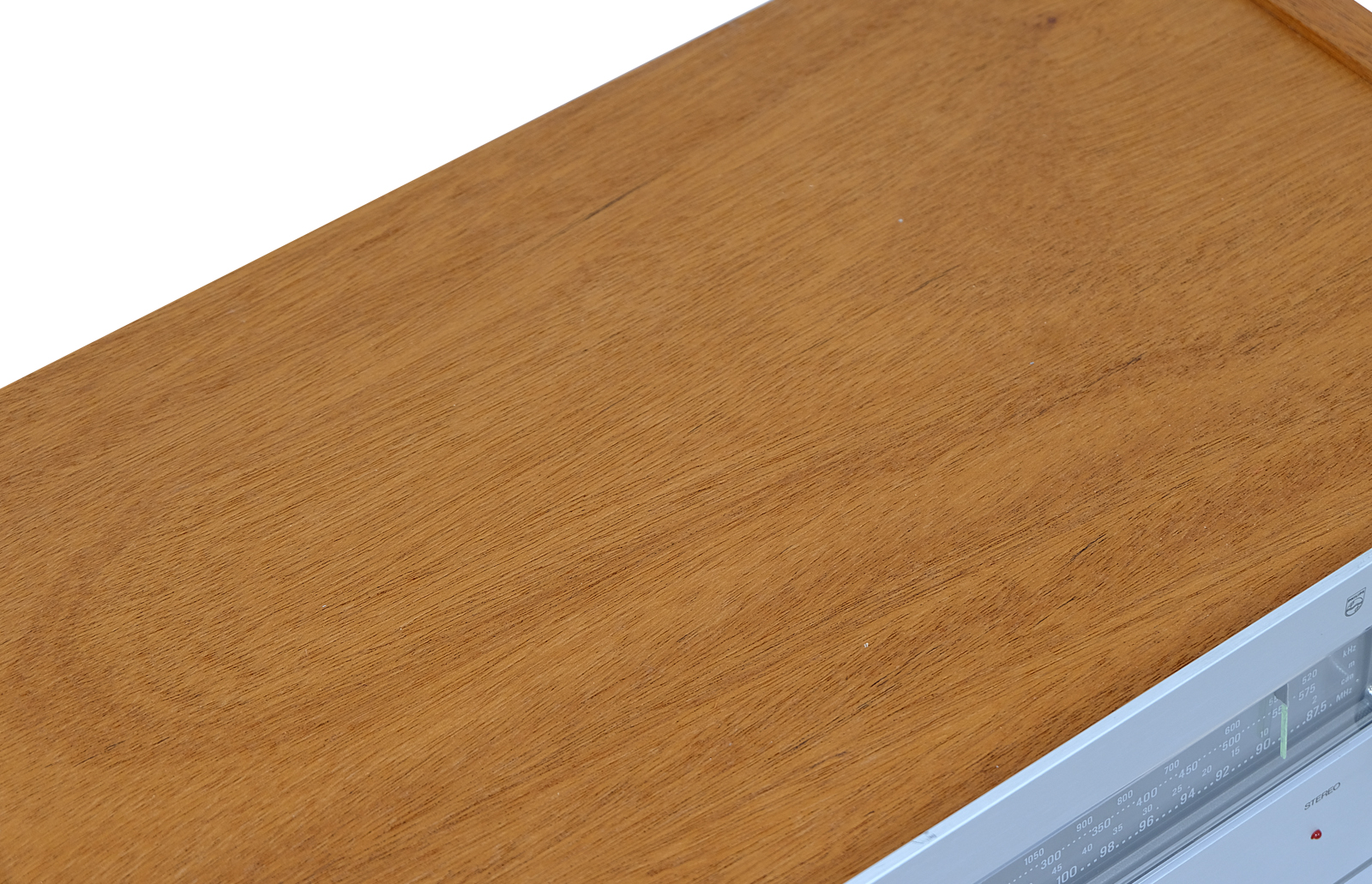 Obudowy zostały poddane całkowitej rewitalizacji, wykonane z drewna egzotycznego merbau. Wykończenie drewna to olei chiński produkowany na bazie naturalnych olei. Drewno bardzo miłe w dotyku. Nowe boczne deski nadają zestawowi elegancki wygląd. Potencjometry w idealnym stanie. Metalowa siatka została oczyszczona ze starych powłok, pomalowana i polakierowana. Urządzenie po całkowitym przeglądzie i serwisie.